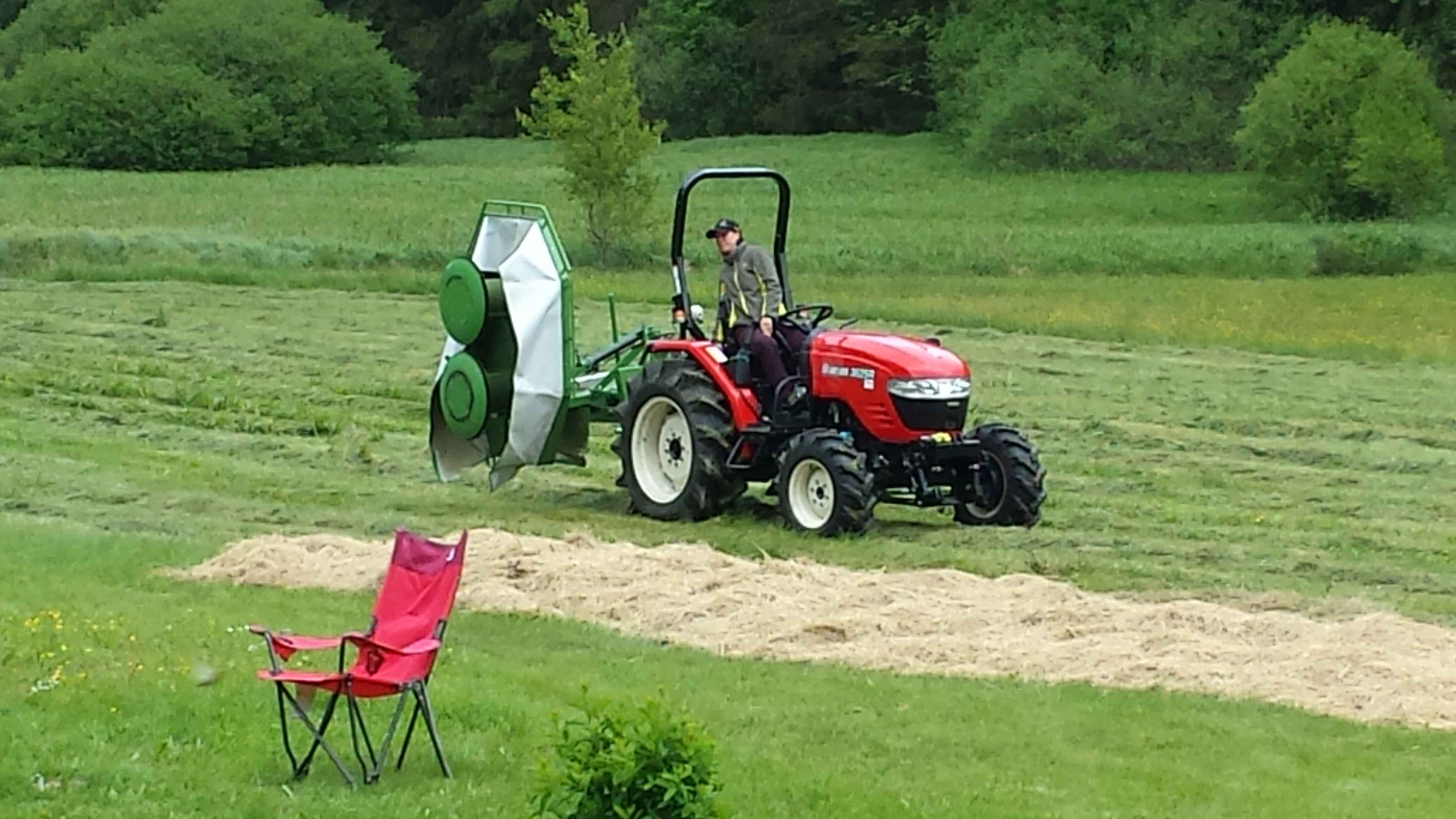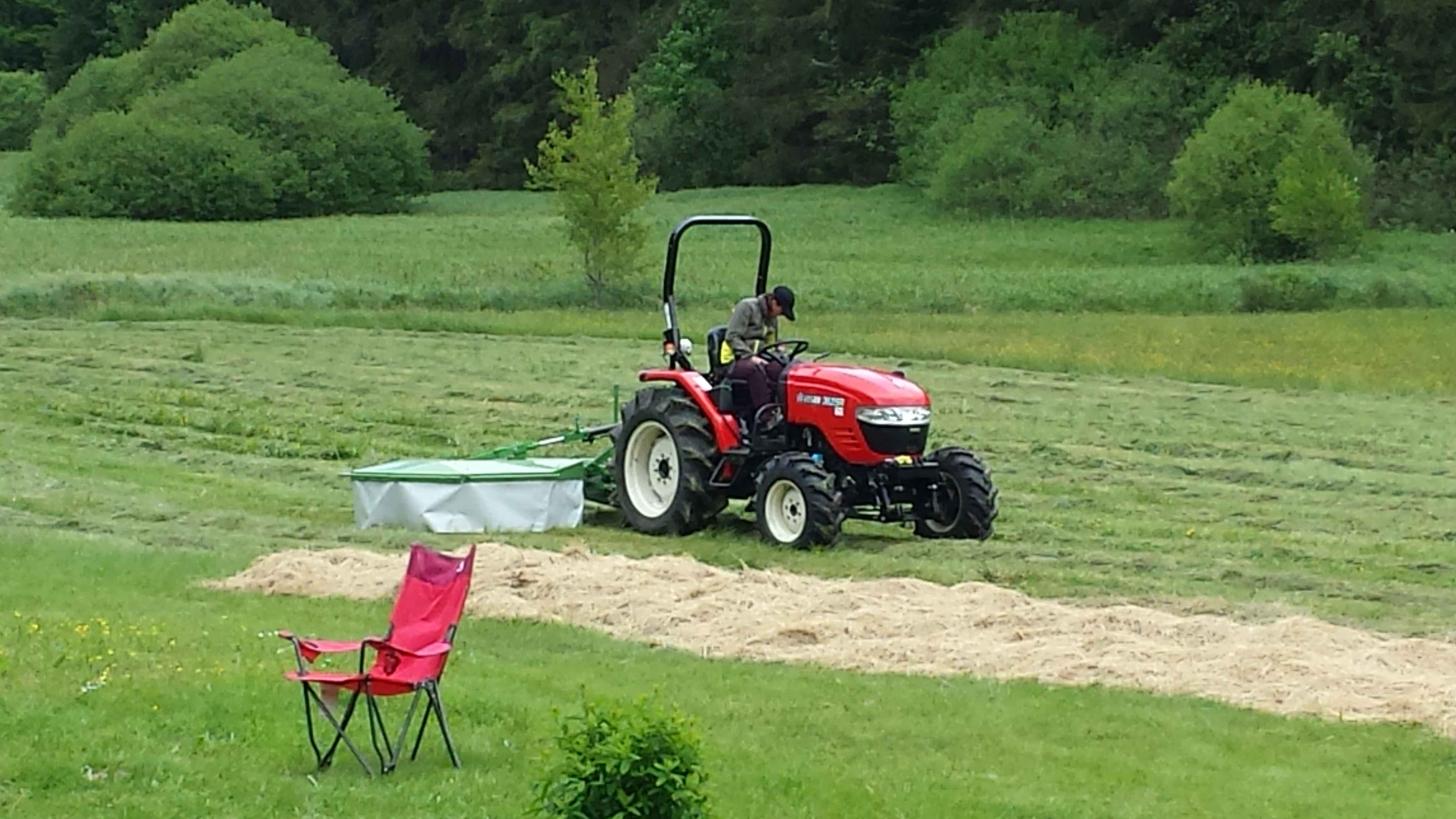 Angesichts der gigantischen Auswahl an landwirtschaftlichen Maschinen, die es mittlerweile möglich machen würden, unsere gut einen Hektar große Wiese mit überdimensionierten Kreiselmähern links, rechts und vorne am doppelt-mannshohen Traktor in zwei, drei Bahnen fertig zu machen, kommt uns unser kleiner Traktor mit dem kleinsten Kreiselmäher auf der rechten Seite fast verloren vor. Der große Bruder fährt oft genug an unserem Haus vorbei, um von den Mäh-Gründen in St. Oswald nach Altschönau zu wechseln, und uns jedes Mal angesichts der schieren Größe zu beeindrucken.