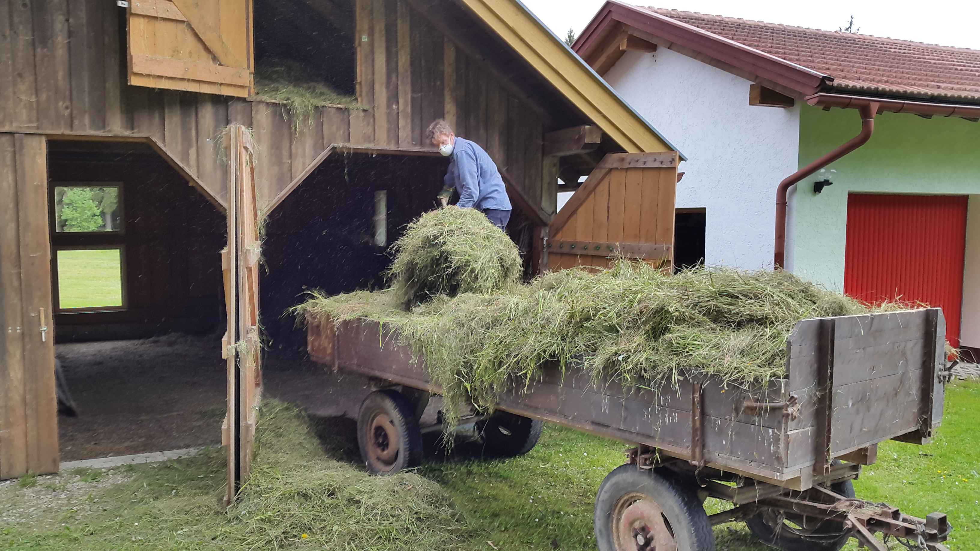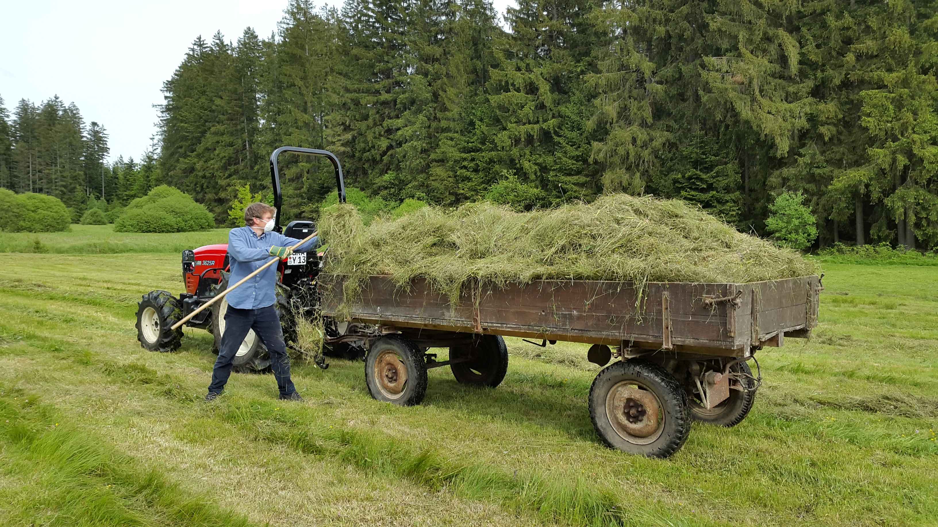 Allerdings wollten wir bewusst alles weitere von Hand machen, um ein Gefühl dafür zu entwickeln, wie viel Heu eigentlich auf unseren Feuchtwiesen zusammenkommt. Und es ist jetzt schon klar – obwohl wir auch nach dem zweiten Wochenende noch nicht fertig sind – es ist viel, viel Heu, das per Hand mit den noch von den Vorvorgänger im Stadl zurückgelassenen hölzernen Rechen (vielen Dank dafür) gewendet und in Reihen aufgehäuft werden muss, ehe der Traktor den alten und ebenfalls von den Vorvorgängern zurückgelassenen Holzwagen (vielen Dank auch dafür) zum Beladen auf die Wiese zieht.