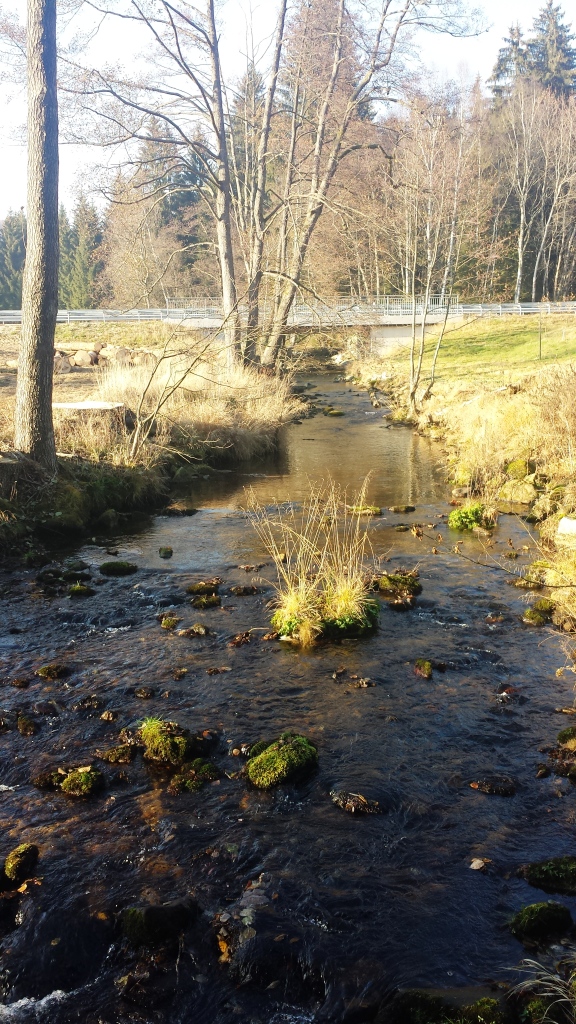 Dabei können wir das Wasser, das beständig aber mittlerweile nur mehr als dünnes Rinnsal in den Beton-Bottich vor unserer Haustür fließt, zur Bewässerung der Pflanzen und Tiere gut gebrauchen. Hühner, Schafe, Obstbäume, Karotten, Salate und Gartenmelde brauchen durchaus viel Wasser, wenn die Natur lediglich von ein bisschen Tau benetzt wird. Der Sommer blieb trocken und die paar Regentage im Herbst reichten nicht aus, um den Wasserspeicher wieder zu füllen. Unsere Wiesen sind auch im November, der eher einem goldenen Oktober gleicht, trocken und die Kleine Ohe, die am Rand unseres Grundstücks entlang fließt, führt kaum noch Wasser mit sich.