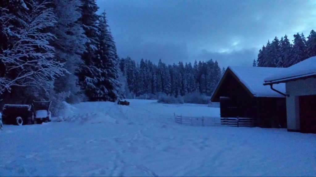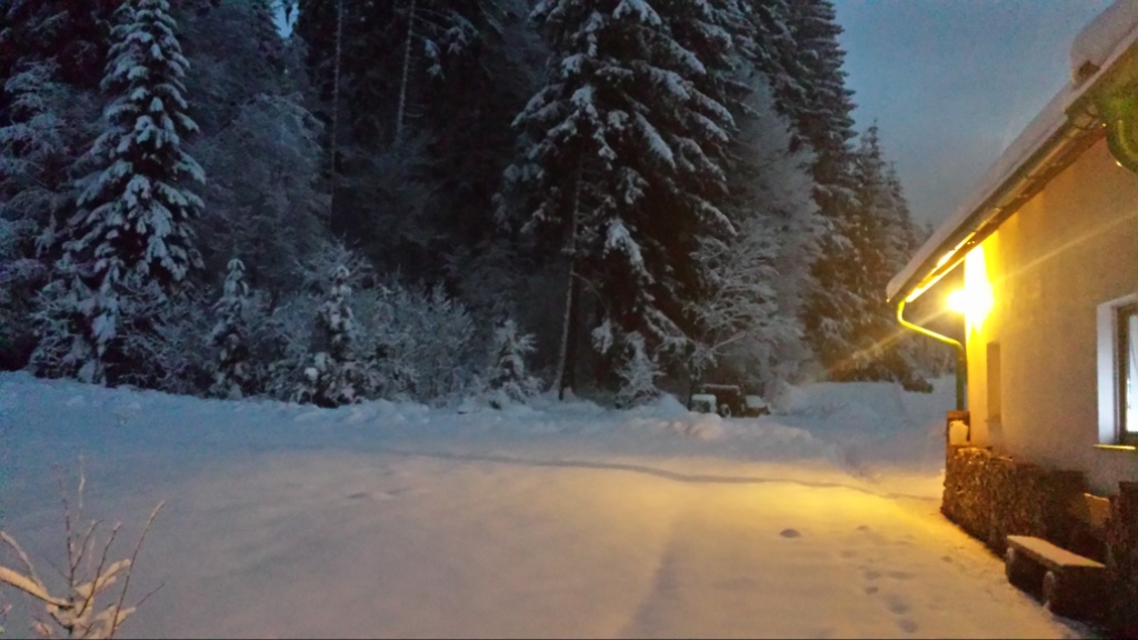 Noch ist es dunkel während unserer Morgenspaziergänge mit Hanabi, aber heute reflektierte der Schnee das erste Dämmerlicht, so dass einen nicht die dunkle Nacht umfasst, sobald man die Taschenlampe ausknipst. Wieder am Haus angekommen wirkt alles gedämpft, schemenhaft angesichts des Schnees, vor allem aber angesichts des Lichtes.