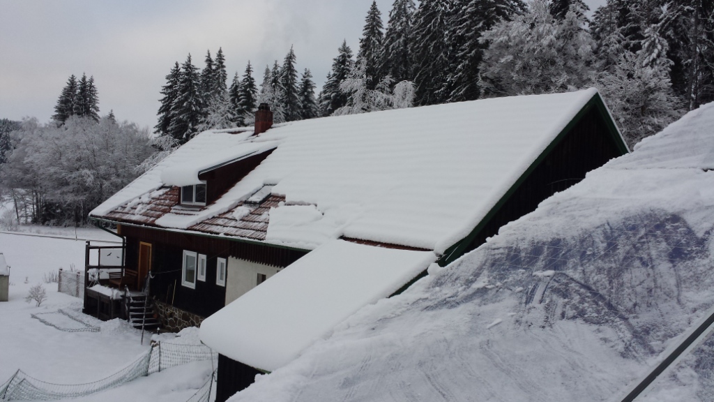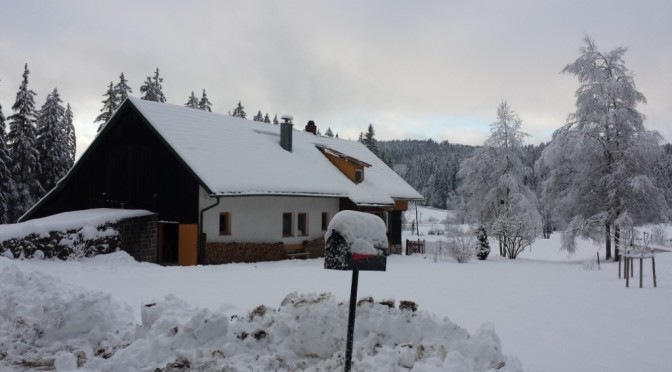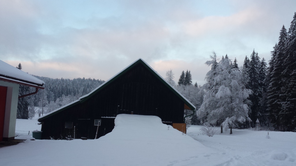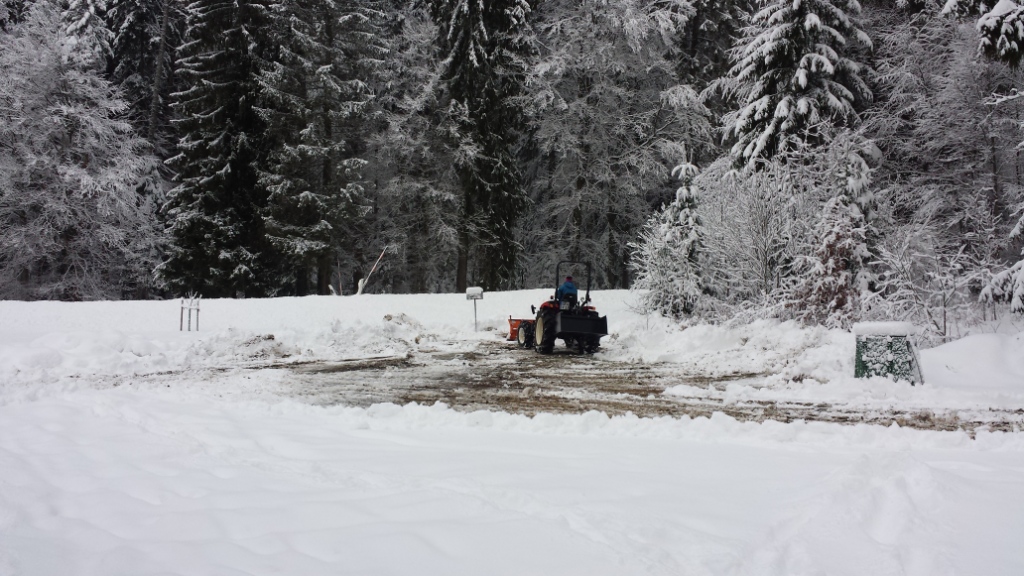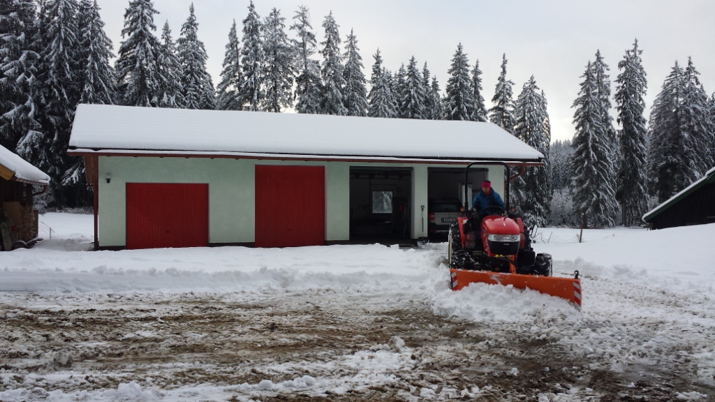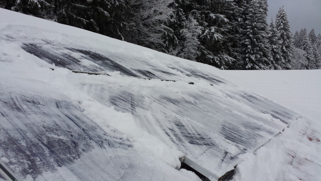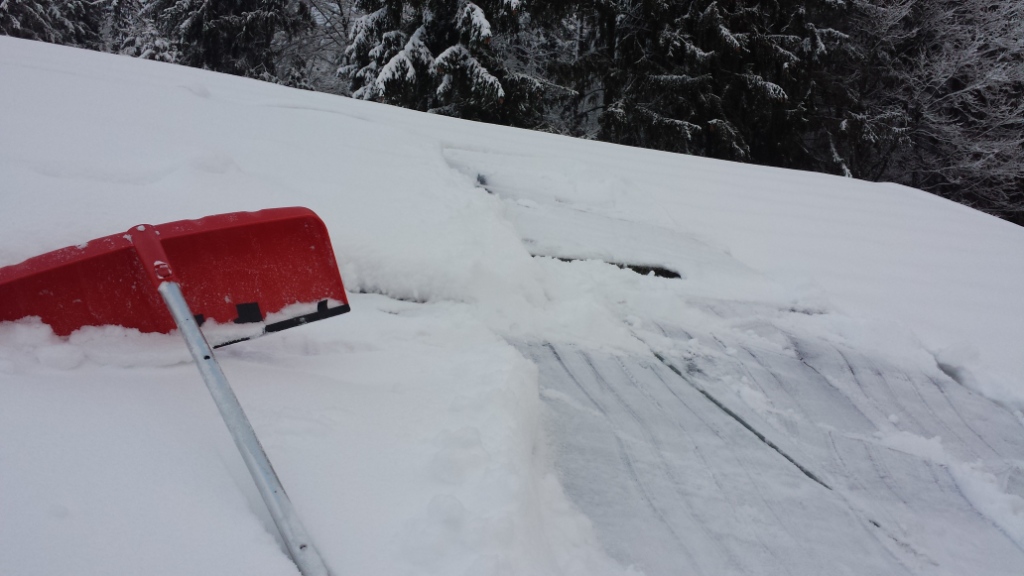Nach dem Frühstück wartet die richtige Arbeit. Der Weg bis zur Straße muss frei geräumt werden, die Solarzellen auf dem Garagendach zumindest vom Schnee befreit werden. Die letzte dünne Schicht festgefrorenen Schnees taut hoffentlich die Sonne weg und lädt dann hoffentlich auch die Batterie ein wenig auf.