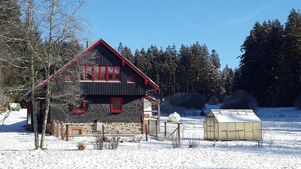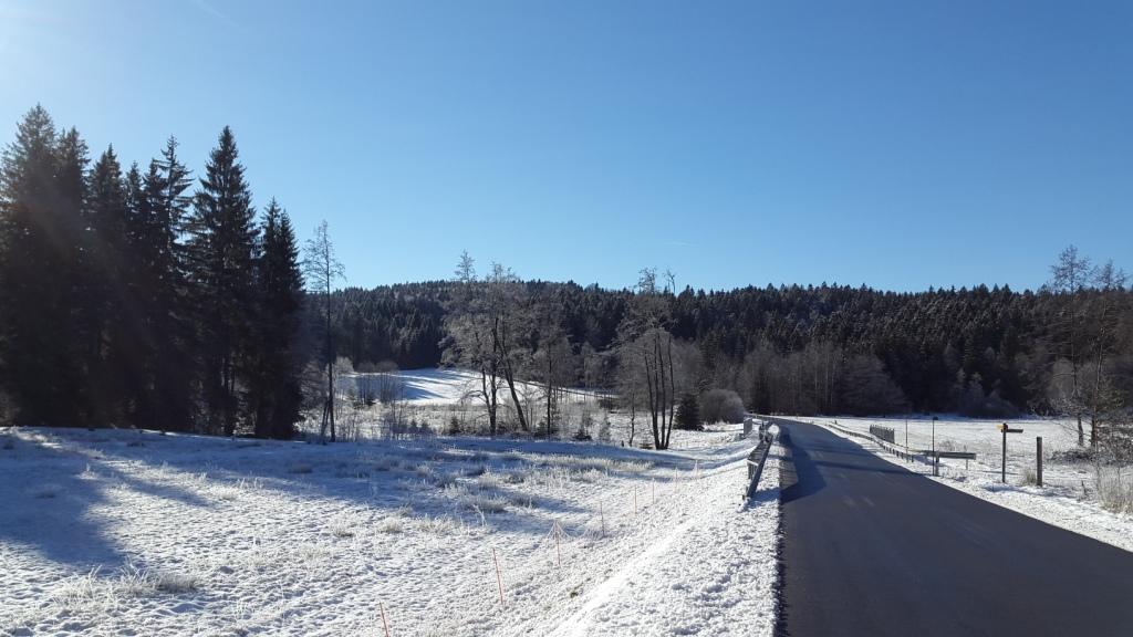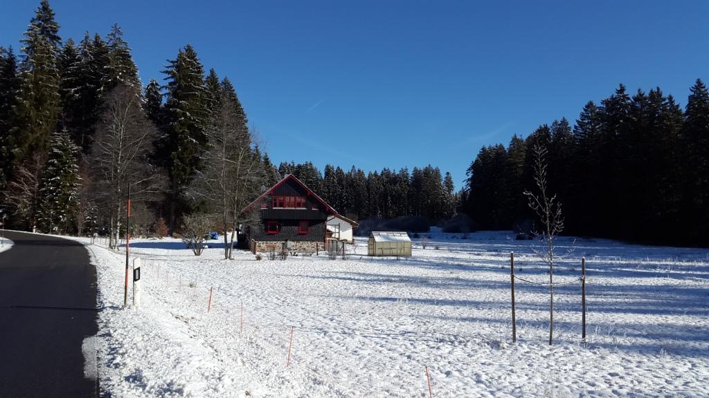 Rund um unser kleines Waidlerhaus liegt mittlerweile eine Schneedecke, die noch recht dünn, aber dick genug ist, um alle Wiesen und Flächen ums Haus in Winterweiß zu tauchen.