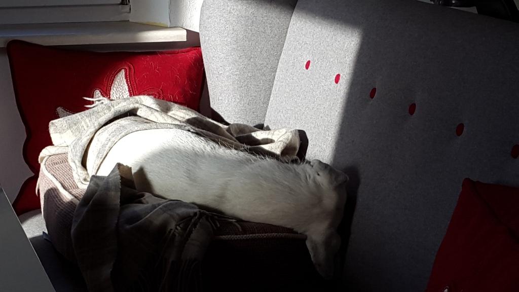 Unser Hund bleibt dieser Tage auch bevorzugt drinnen. Nächsten April wird Hanabi 15 Jahre alt. In Hundejahren ungefähr 80. Da darf man seine Zeit im Winter schon mal überwiegend in eine warme Decke eingewickelt verbringen. Dass Hanabi dabei allerdings die Hälfte unseres neuen Küchensofas belagern würde, war so nicht geplant, aber durchaus erahnt. Und wenn nicht jetzt, wann dann dürfen wir unseren alten Wuffi so richtig von vorne bis hinten verwöhnen.