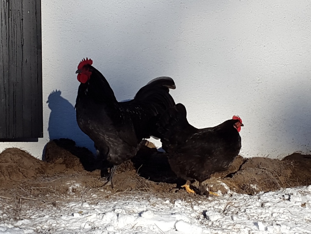 Die Hühner im alten Stall kennen die Kälte schon von letztem Winter, plustern sich auf, gehen früh zu Bett, stehen später auf und haushalten mit ihrer Energie.