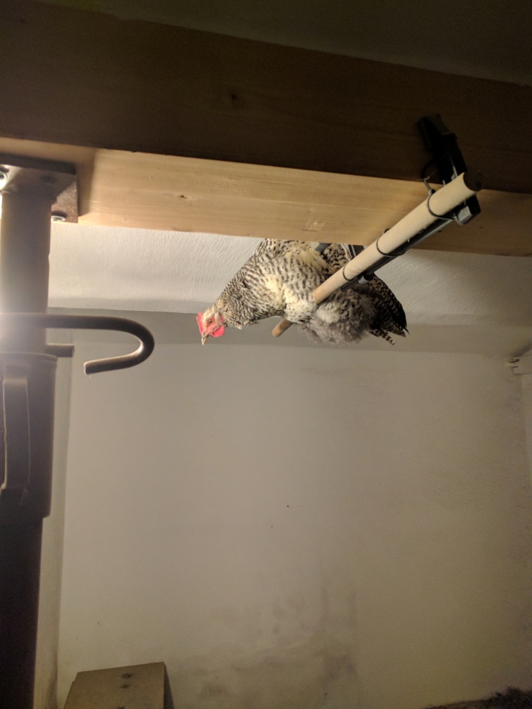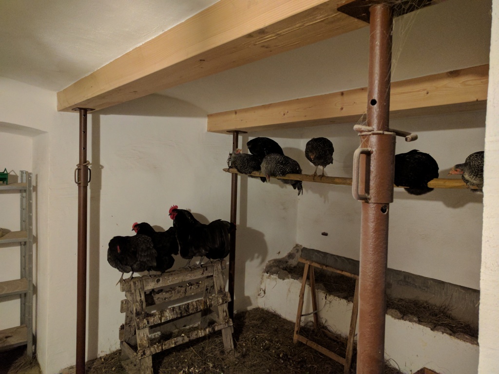 Die vierköpfige Schar Australorps, die seit kurzem in das Eierlegende Alter gekommen ist, wohnt zusammen mit einer bunten Schar, bei der sich das Sperber-Gen durchgesetzt hat, wie man unschwer erkennen kann. Und der junge Sperber-Hahn beansprucht vorsichtshalber den höchsten Platz. Noch droht kein Hahnenkampf, denn noch sind die Hühner, die uns die Glucke im Oktober ausgebrütet hat, zu klein.