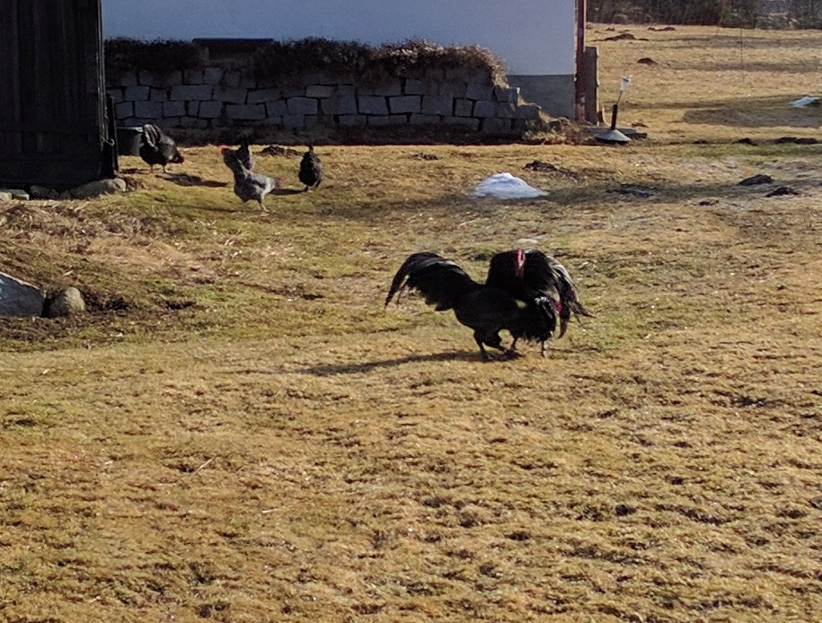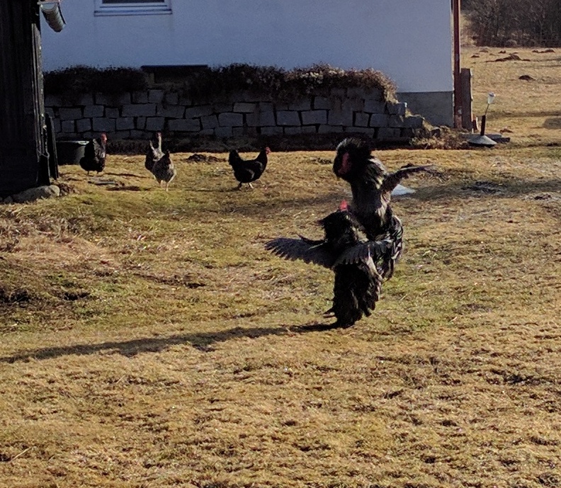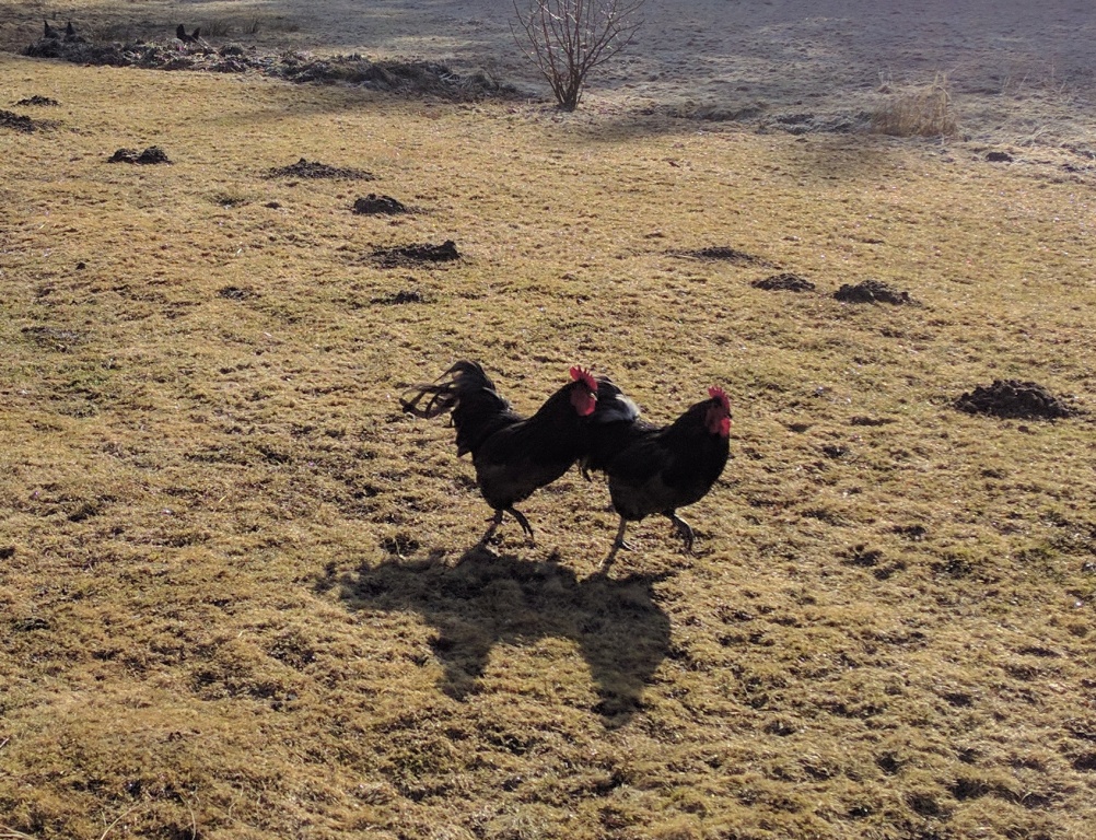 Ein bisschen Blut ist geflossen, aber die beiden waren ganz still und auf sich konzentriert, während die Damenwelt ungestört ihrer Lieblings-Beschäftigung nachgehen konnte: picken und scharren, scharren und picken. Louie und Arnie vollzogen währenddessen eine Art Ballet: um den anderen herum, dann unten durch, kurz hinterher, Kehrtwende marsch, auf den Kopf gehackt und wieder gegeneinander in die Luft geflogen. Nach einer Stunde war der Verfolgungstanz beendet. Arnie verbrachte den Rest des Tages mit seinen Hennen am Waldrand und Louie mit seinen rund ums Haus. Abends ging es für jede Schar wieder in den angestammten Stall. Wie es weitergehen wird. Wir werden es erleben.