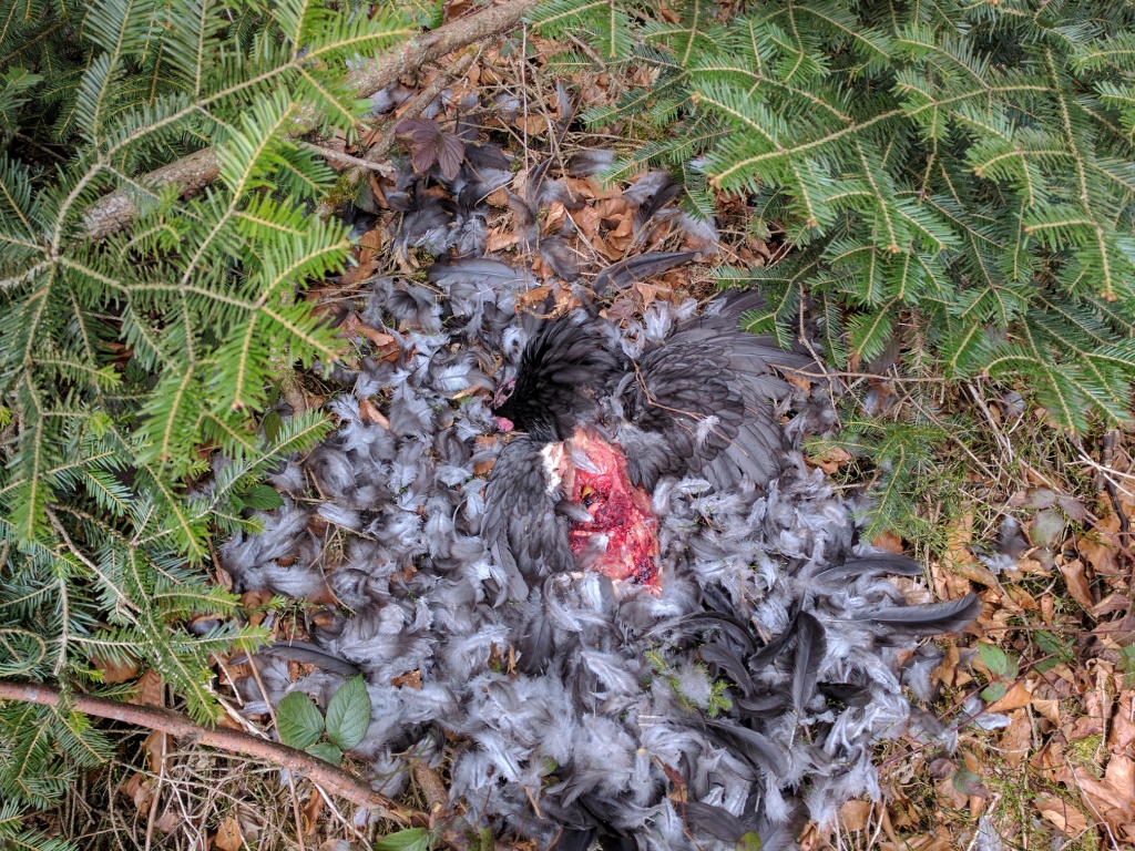 Am nächsten Tag waren es nur noch die Federn, die von dem grausigen Ereignis kündeten. Die gleiche Stelle bietet ein ähnliches Bild. Allerdings fehlt alles Fleisch, die ungelegten Eier und sogar die Knochen sind ordentlich vertilgt.
