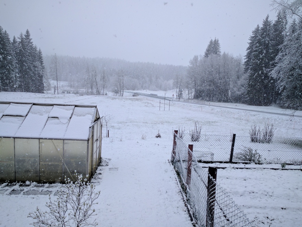 Mittags sah es noch nach einem typischen April-Schauer aus, auch wenn das Grün langsam vom Weiß übertüncht wurde. Der Ostersonntag war zwar windig, aber weitgehend trocken. Heute wurde es den Tag über immer kälter und ab mittag schneite es – anhaltend wie es scheint. Der einzige Vorteil, den die späte Rückkehr der weißen Pracht mit sich bringt, ist die Isolierung, die der Schnee unseren Setzlingen bietet. Denn es soll in den kommenden Nächten auch noch mal so richtig kalt werden. Die Schafe hatten heute Vormittag noch einmal Gelegenheit, von dem frischen Grün zu probieren, nachdem wir ihnen ein weiteres Areal abgesteckt hatten.
