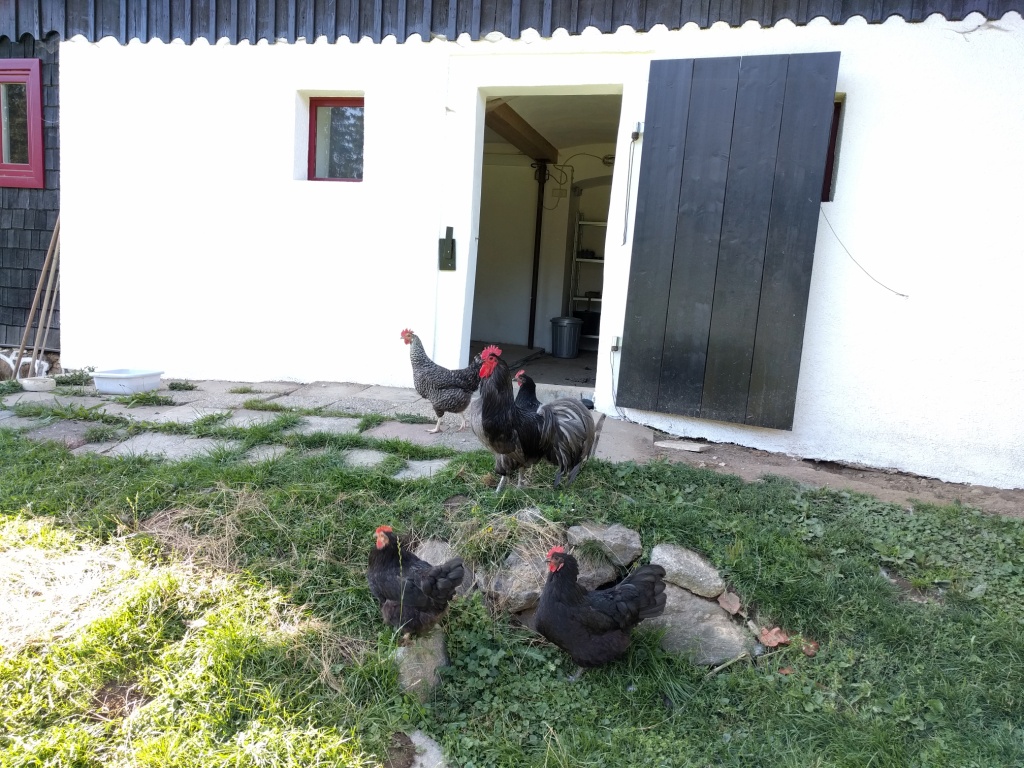 Wahrscheinlich werden wir dem Testosteron-Wettkampf ein Ende bereiten, wenn ich ab Mitte August Urlaub habe. Zumal die beiden mittlerweile angefangen haben, auch uns zu hüten bzw. in ihre Hühnerschar eingemeinden zu wollen. Dem ist zwar leicht Abhilfe zu schaffen, wenn man einen Besen oder Stecken in die Hand nimmt. Im Winter auf engerem Raum muss dieser Machtkampf aber definitiv nicht mehr sein. Statt Streicheln steht dann Ausnehmen und Rupfen auf dem Urlaubsplan.