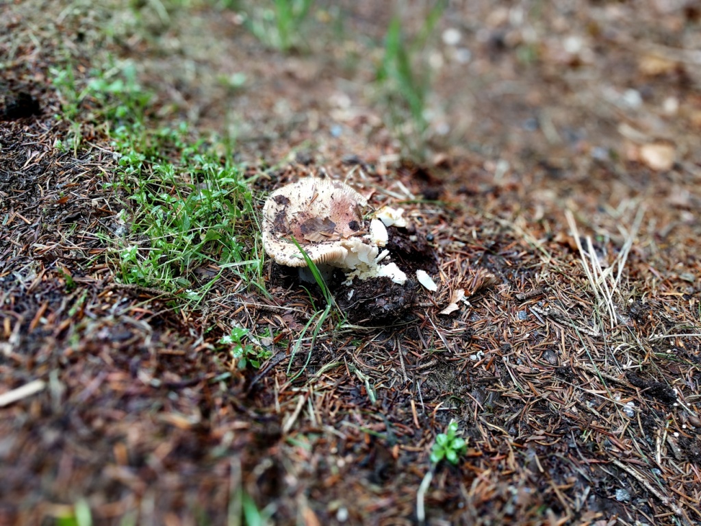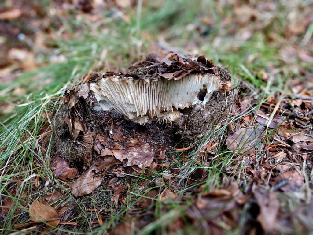 Während einer unserer morgendlichen Hunde-Spaziergänge entdeckte ich die Lamellen eines Pilzes, die sich weiß aus der dunklen Erde schoben. Noch etwas schlaftrunken musste ich an die Barten eines Wals denken, die das Meerwasser bis zur Oberfläche nach Plankton durchpflügen. Pilze und im Wasser lebende Säugetiere haben wenig gemein. Das gilt auch für den trockenen Boden am Rand einer Straße durch den Nationalpark Bayerischer Wald im Hinblick auf die Weiten der Ozeane. Aber irgendwie konnte ich mich den ganzen Vormittag nicht von diesem aberwitzigen Vergleich befreien. Ungeachtet dessen ist der Pilz, der es schafft mit seiner Kappe (oder wie in diesem Fall mit den Lamellen) durch beinahe jeden Untergrund zum Tageslicht zu gelangen und mit seinem Myzel-Wurzelwerk zu den größten Lebenwesen der Erde zählt, ein faszinierendes Lebenwesen.