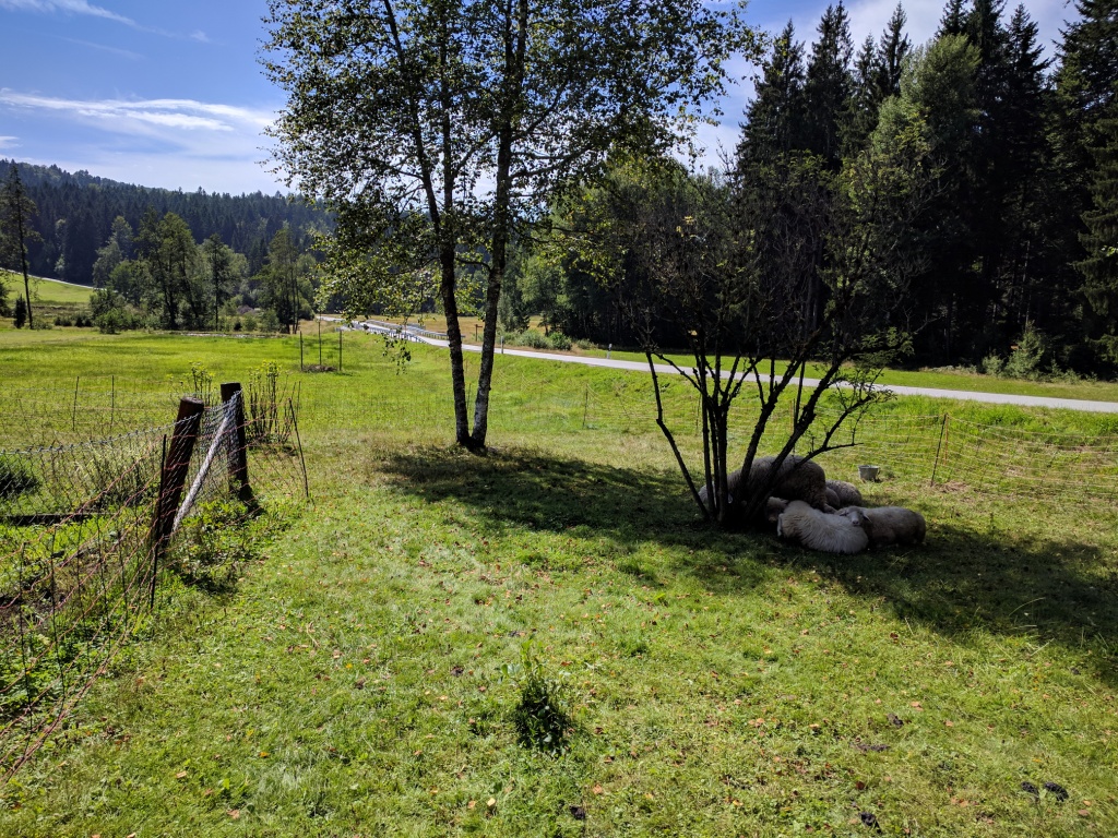 Jetzt dürfen sich sich noch rund ums Haus fressen. Und die Wiese vor bzw. links und rechts vom Gemüsegarten war noch unberührt. D.h., bis vor kurzem lag dort noch keine Schafsdung. Das hat sich mittlerweile geändert. Die Johannisbeer-Büsche haben zudem eine Kurzhaar-Frisur verpasst bekommen; denn für Schafe scheinen auch die Blätter schmackhaft zu sein, wenn man denn an sie heran kommt. Ohne Schatten findet die August-Hitze jedes Waldschaf doof, vor allem wenn der Schafscherer noch auf sich warten lässt. Angesichts der Wolfsgeschichten hier im Bayerischen Wald ist es uns derzeit ganz recht, wenn die Schafe im Moment so nah am Haus sind. Und im Winter wird die Stalltür zu gemacht – das ist sicher.