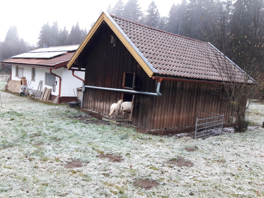 So ganz wohl war uns ohnehin nicht angesichts des ersten Wolfsrudels im Bayerischen Wald und der aus dem Tierfreigelände entkommenen bzw. herausgelassenen Wölfe, aber das Gras sah noch zu verführerisch aus. Also durften unsere sechs Schafe auf der zum Waldrand hinter dem Haus nach oben führenden Wiese die letzten grünen Halme abfressen. Besonders viel Strom auf dem Elektrozaun konnte die Sorge in der Nacht zumindest ein wenig abschwächen.
