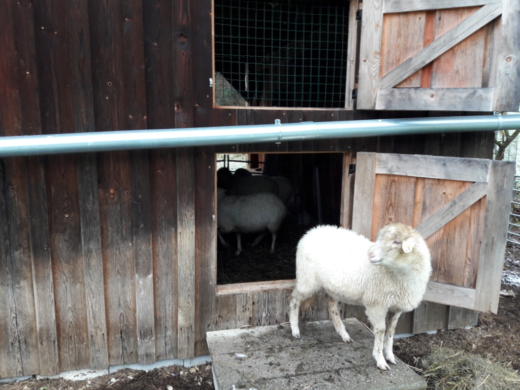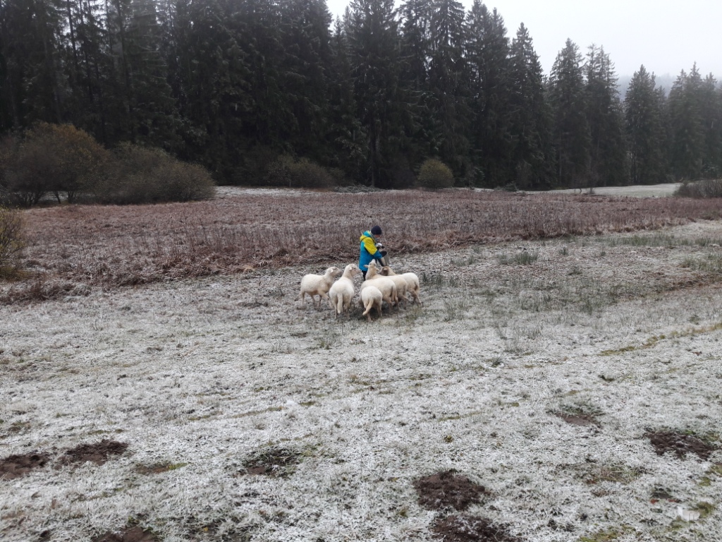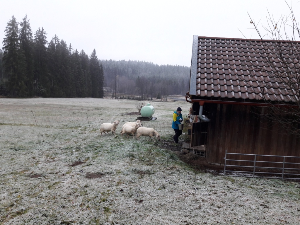 Wir hatten es ohnehin vor – die Schafe von ihrem letzten Weidegrund oben am Waldrand herunterzuholen. Der heutige Wintereinbruch hat uns heute einen weiteren Grund geliefert. Nasser Schnee, der wohl nicht lange liegen bleiben wird, aber dem mittlerweile an einigen Stellen schon recht gelben Gras endgültig den Winterlook verpasst.