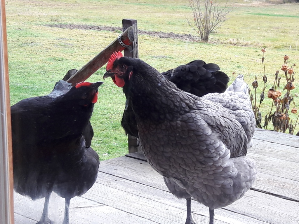 Der erste Schnee hat unsere Schafe zurück ans Haus gebracht, die Hühner wollten auch ohne Schnee aber angesichts der kalten Temperaturen am Tag zuvor am liebsten uns auf die Couch: zumindest machte es den Anschein, als sie sich vor der Terrassentür postierten. Glücklicherweise ist Hanabi schon so alt, dass sie das alles nicht mehr zu stören scheint.