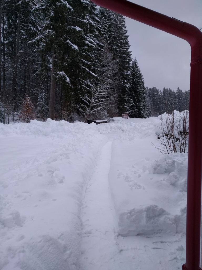 Die Loipen sind alle gespurt, aber Joggen ist nur mehr eingeschränkt möglich. Nach drei Wochen krankheitsbedingter Pause musste es dennoch sein. Die schmale Straßenmitte, die der Schneepflug frei geräumt hat, müssen sich Hundebesitzer mit Spaziergängern (Joggern) und den Autos teilen.