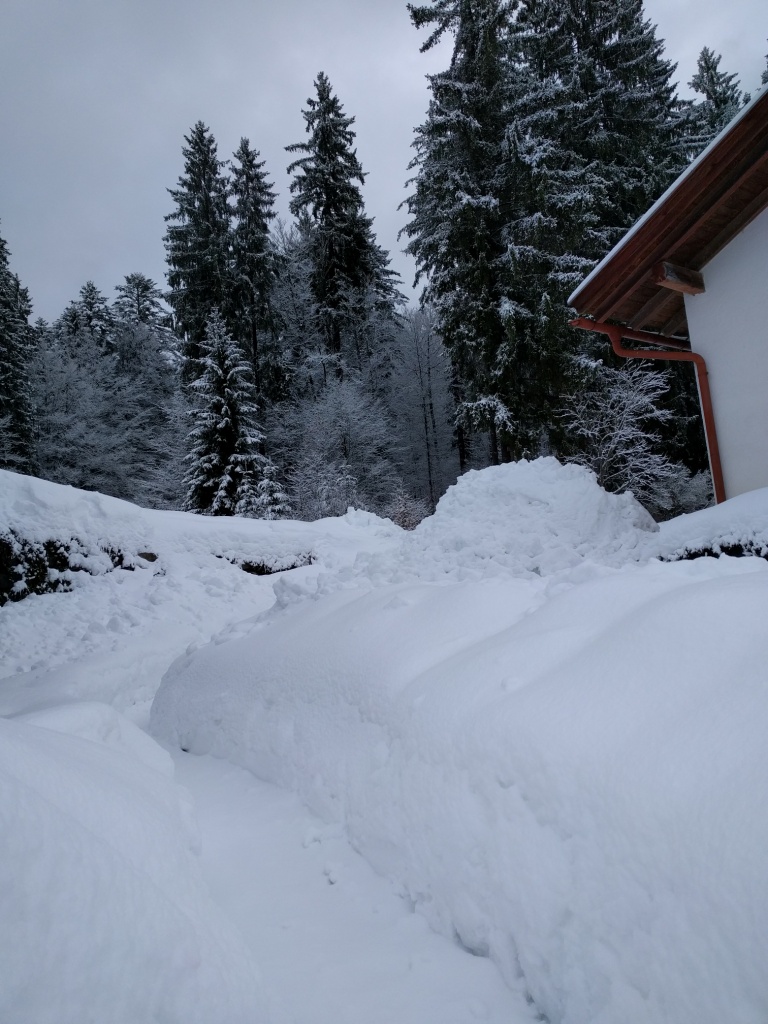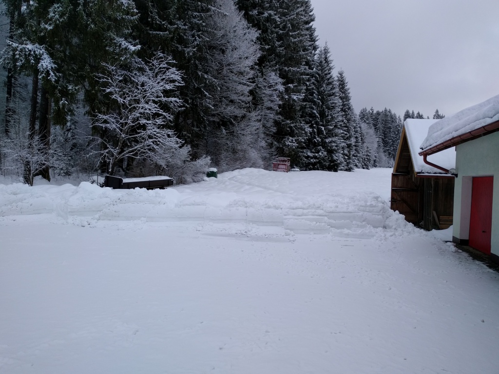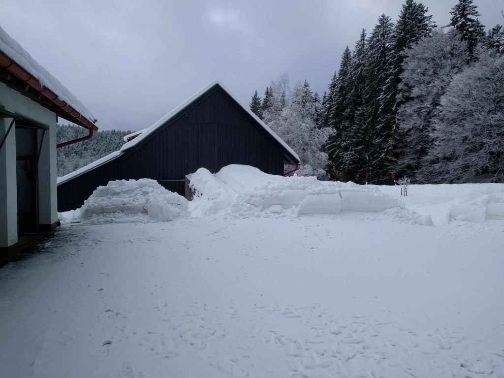 Als die nasse Schneeladung von den Garagen krachte, bildete sich ein kleiner Wall vor den Toren. Silke konnte nur mit viel Muskelkraft den Weg für unsere zwei Autos freiräumen, ehe ich mit schwerem Gerät (vor allem der Erd-/Schneeschaufel hinten am Traktor) die Hügel einzuebnen vermochte. Die Schneehaufen vor den Garagen zwingen uns mittlerweile dazu, ganze Schneeladungen auf die andere Seite der Straße zu kippen. Zum Glück haben wir den Platz. In Altschönau ist es neben der Straße angesichts der Schneeberge ziemlich eng.