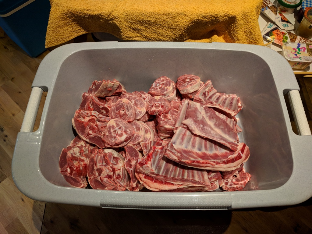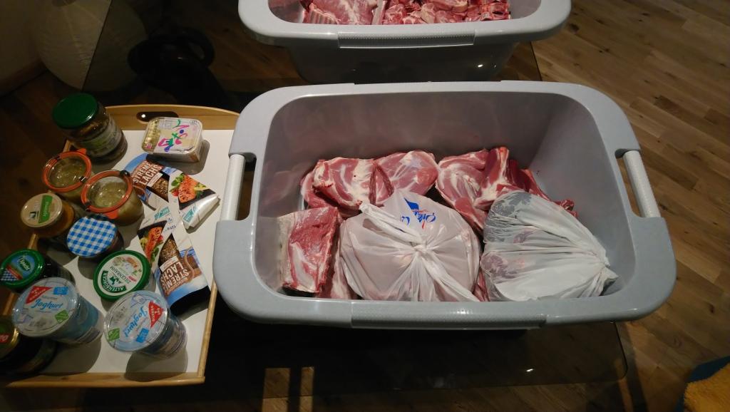 Von unserem Landmetzger des Vertrauens haben wir heute drei unserer Lämmer als schöne Bratenstücke, Keulen, Schlegel, Koteletts, Herz und Leber zurückbekommen. Aus dem vierten Lamm werden zahlreiche Lammwürstchen entstehen und aus dem zweijährigen Schaf, das leider auch unsere Herde verlassen musste, werden zahlreiche Portionen Gehacktes werden. Es ist zwar durchaus ein wenig traurig, aber wenn Fleisch, dann nach Möglichkeit aus dem eigenen Betrieb.