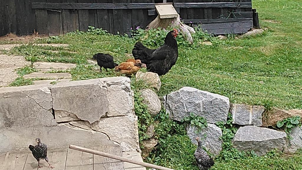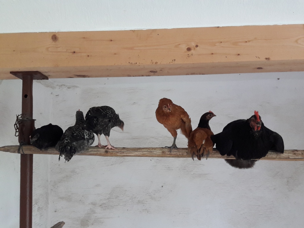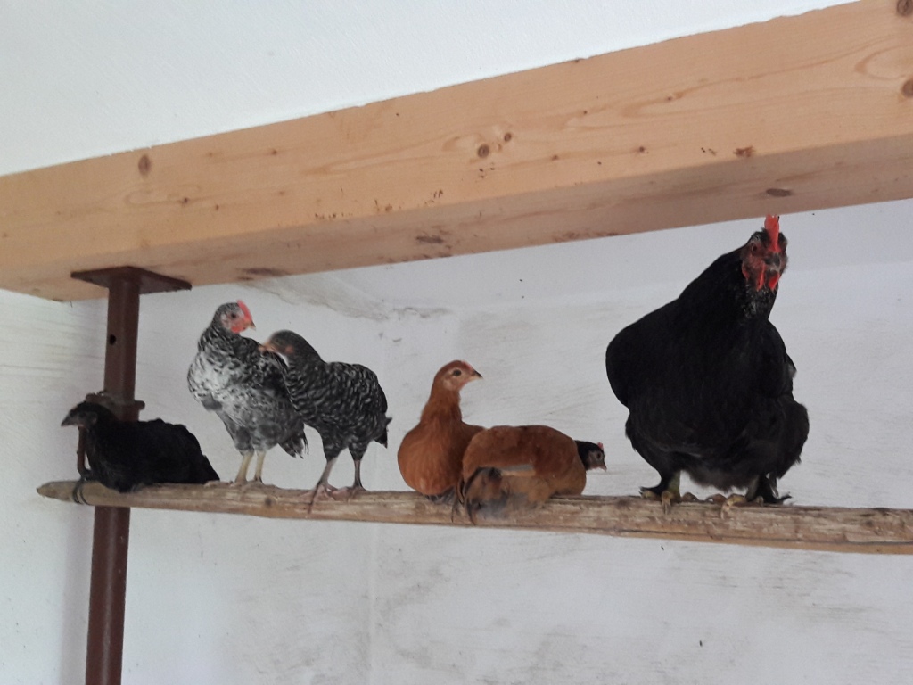 Während die Hühnerschar auf fünf geschrumpft ist, ist unsere Glucke ihrer fünf Teenager schon fast überdrüssig. Als letzte Lektion stand das Schlafen auf der Stange auf dem Lehrplan.