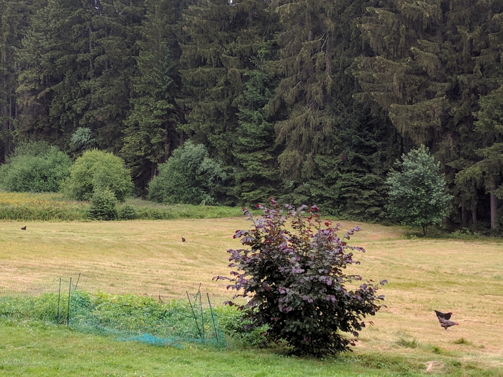 Von unseren zwei gesperberten Hennen hat sich der Fuchs eine geholt und an ein paar Stellen Richtung Waldrand Federbüschel zurückgelassen. Auf diese Weise konnten wir überhaupt rekonstruieren, was wohl geschehen ist. Die anderen Hennen haben sich davon nicht beeindrucken lassen und sind weiter auf der mittlerweile abgeernteten Weide unterwegs ziemlich dicht am Waldrand bzw. dem hohen Gilbweiderich und damit in ständiger Gefahr. Gut, wem das nicht bewusst ist – und wir können angesichts unseres alten Hundes ohnehin nichts ändern.