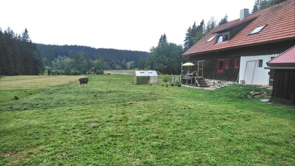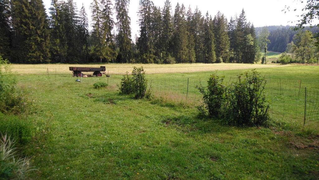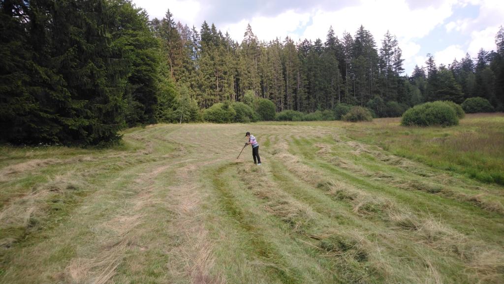 Zwei Tage ohne Gewitter und mit viel Sonne waren vorhergesagt. Also haben wir die Wiesen hinter dem Haus gemäht und das Heu zum Trocknen ausgebreitet. Der schmale Streifen Gras zwischen Wald und Buschlandschaft gehört zwar dem Nationalpark, wir können die Fläche jedoch bewirtschaften, um unsere Schafe über den Winter zu bringen.