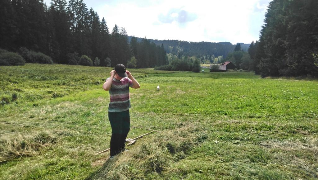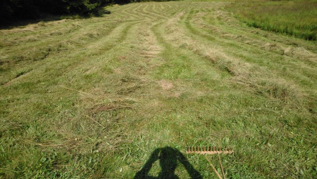 Dann stand Handarbeit auf dem Plan. Denn trotz eines kleinen Kreiselmähers für unseren Traktor und einem kleinen Ladewagen Baujahr 1972 müssen wir das Wenden und Reihen-Bilden mit dem gemähten Gras noch mit der Hand und einem Holzrechen verrichten. Das ist zwar eine recht meditative Tätigkeit, wie man auf dem obigen Video erfahren kann, aber durchaus anstregend.