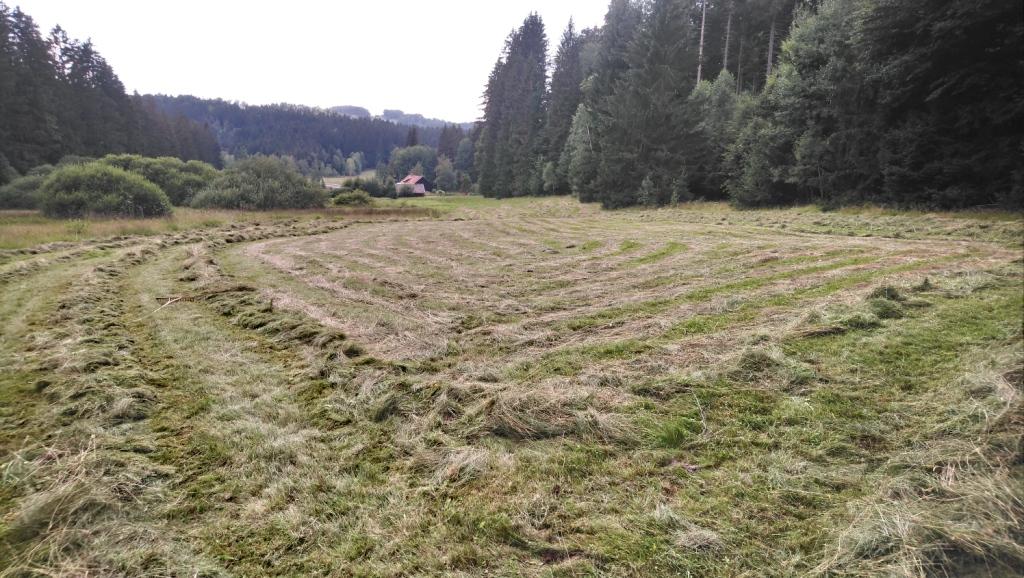 Allerdings war am nächsten Tag Gewitter angesagt, so dass wir mit einem mulmigen Gefühl spät am Abend mit viel Kraftanstrengung 60 Säcke per Seilwinde auf den Stauraum oberhalb des Schafstalls gebracht haben. Und in der Tag war das Heu stellenweise noch zu nass. Dank einer mehrmaligen Wühl- und Krabbelaktion auf dem Bretterboden zwischen Schafstall und Dach konnte es aber ausreichend nachtrocknen, so dass unsere Schafe die Halme nicht verschmähen dürften. Für die nächsten Wiesen – das war uns jetzt aber klar – brauchte es mindestens zwei Tage stabiles, schönes Wetter, damit wir mit unseren technischen wie konditionellen Möglichkeiten die Ernte sicher einfahren können. Die Wiese am Waldrand war letztes Wochenende fällig, die Wiesenflächen vor unserer Bank vor drei Wochen, ohne dass wir dies dokumentiert hätten. Es waren Hauruck-Aktionen zwischen Silkes Schulbesuchen bzw. Arbeit im Pflegeheim und meiner Pendelei zwischen München und der Bergerau, zwischen BR-Arbeit vor Ort und am Computer zu Hause, auch wenn ich formal Urlaub hatte.