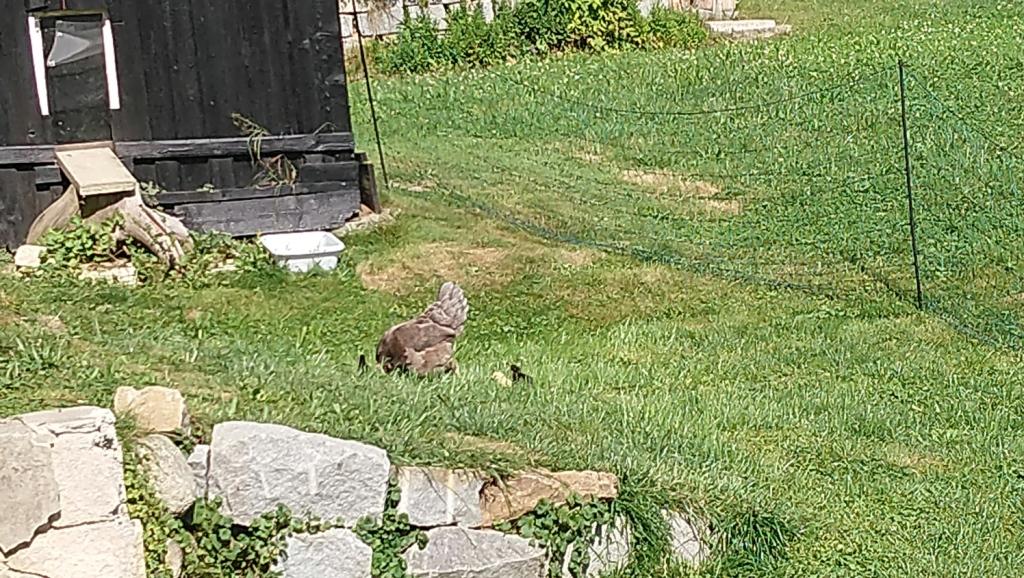 Unser Zorn ist hingegen verraucht und wir erfreuen uns an den vier Küken, die Gerda ausgebrütet hat (ein Küken hat es nicht geschafft, sich durch die Eierschale zu picken). Das einstige Streichelhuhn Gerda ist als Glucke genauso menschen-scheu und vorsichtig wie unsere Alt-Glucke Krawall-Susi. Möge der Nachwuchs uns und nicht den Fuchs erfreuen.