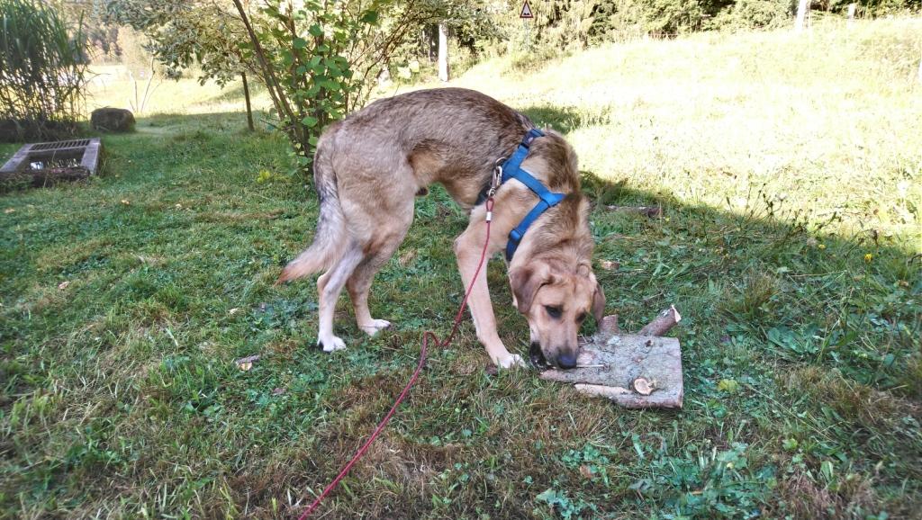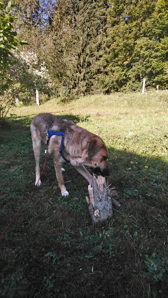 Als nächstes bekommt Haru in der Scheune ihr Fressen und dann Jackson die morgendliche Portion in seinem Zimmer. Seit einem Monat leben wir jetzt schon mit zwei Hunden sowie unverändert mit einer Katze, einem Hahn, vier Küken, sechs Hennen, acht Schafen zusammen und haben uns (abgesehen davon, dass Hanabi Jackson grundsätzlich doof findet 😉 sehr gut aneinander gewöhnt. Jacksons Napf ist nach dem erst zögerlichen Beschnuppern am Ende wieder so glänzend wie am Anfang. Dann geht es mal mit mal ohne Frühstück meinerseits zu einem knapp einstündigen, schnellen Spaziergang los mit Jackson durch die Wälder des Nationalparks. Auf das Wort „langsam“ reagiert das Riesen-Vieh durchaus, man muss es ihm nur oft genug zu Gehör bringen. Ansonsten ist die Nase meist am Boden und der Drang nach vorne ziemlich ausgeprägt – angesichts der Größe ist es also echt von Vorteil, dass Jackson im Gegensatz zu Hanabi auf Worte reagiert.