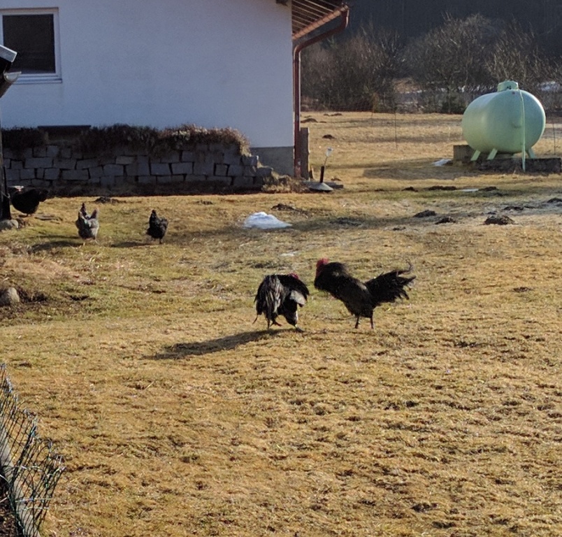 Ein bisschen Blut ist geflossen, aber die beiden waren ganz still und auf sich konzentriert, während die Damenwelt ungestört ihrer Lieblings-Beschäftigung nachgehen konnte: picken und scharren, scharren und picken. Louie und Arnie vollzogen währenddessen eine Art Ballet: um den anderen herum, dann unten durch, kurz hinterher, Kehrtwende marsch, auf den Kopf gehackt und wieder gegeneinander in die Luft geflogen. Nach einer Stunde war der Verfolgungstanz beendet. Arnie verbrachte den Rest des Tages mit seinen Hennen am Waldrand und Louie mit seinen rund ums Haus. Abends ging es für jede Schar wieder in den angestammten Stall. Wie es weitergehen wird. Wir werden es erleben.