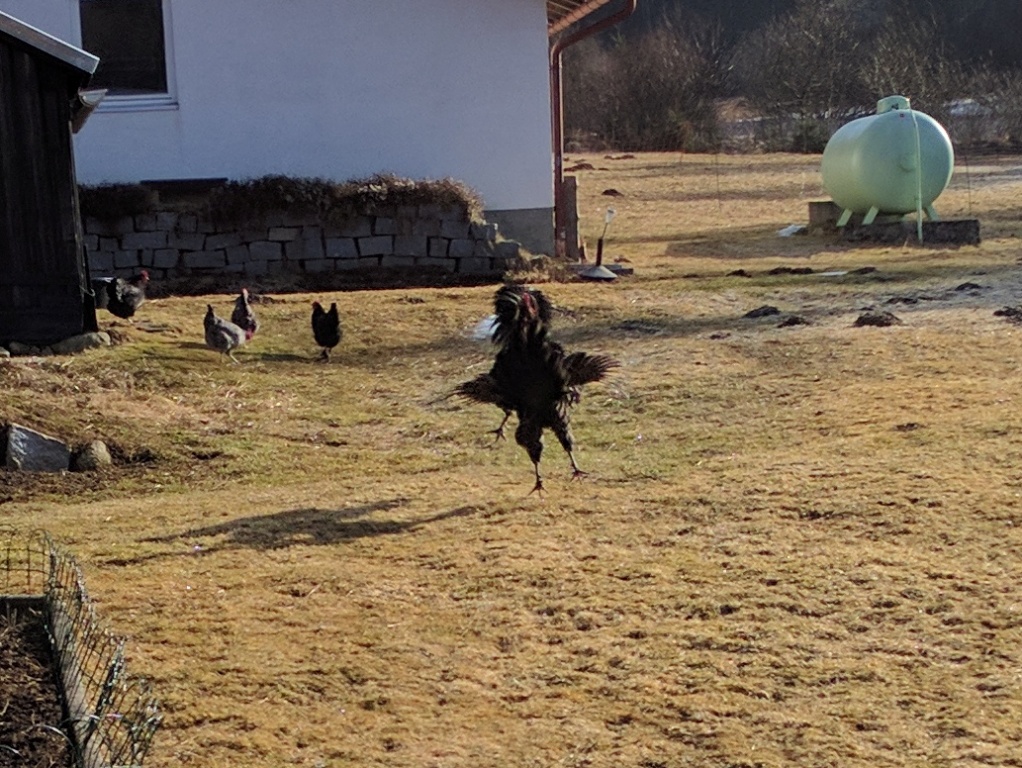 Wahrscheinlich werden wir dem Testosteron-Wettkampf ein Ende bereiten, wenn ich ab Mitte August Urlaub habe. Zumal die beiden mittlerweile angefangen haben, auch uns zu hüten bzw. in ihre Hühnerschar eingemeinden zu wollen. Dem ist zwar leicht Abhilfe zu schaffen, wenn man einen Besen oder Stecken in die Hand nimmt. Im Winter auf engerem Raum muss dieser Machtkampf aber definitiv nicht mehr sein. Statt Streicheln steht dann Ausnehmen und Rupfen auf dem Urlaubsplan.