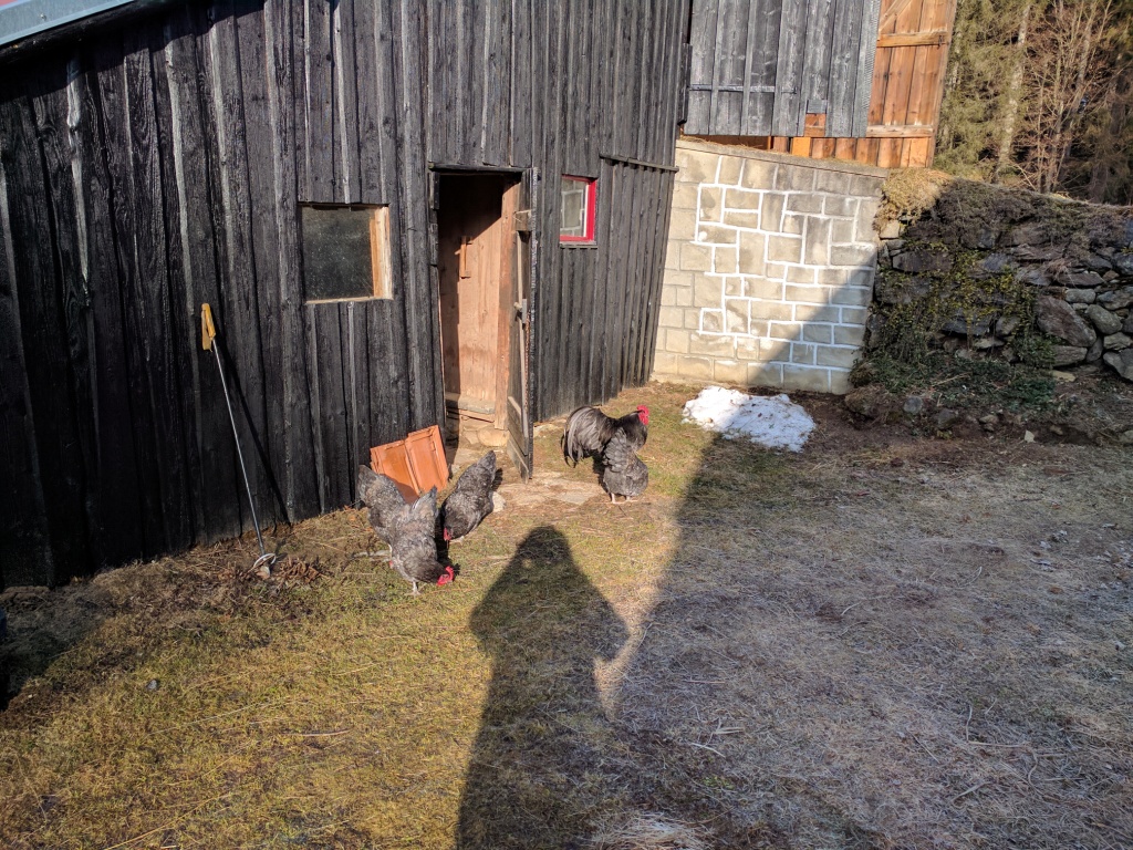 Arnie, der mittlerweile vierjährige Ersthahn, mit nur mehr vier Hennen aus seiner ursprünglichen Schar, wohnen im alten Hühnerstall, den wir wieder ordentlich hergerichtet hatten.Einer der beiden Ausgänge ist dieses Fenster, durch das Arnie genau beobachtet, dass das Jung-Volk zuerst ins Freie darf. Doch auch für ihn und seine Hennen wird sich die Tür auf der anderen Seite öffnen. Noch immer ist dies nicht ganz möglich, denn der Frost hat den Boden weit ins Erdreich hinein gefrieren lassen. Immerhin sind von den Schneemassen nur noch Reste übrig, die übrigens von den Hühnern gerne angepickt werden, als ob es sich dabei um Reis oder noch besser Ameisen-Eier handeln würde – neben Schnecken-Eiern die Lieblingsspeise unserer Hennen. Nach der jungen Schar um Louie und seinen sieben Hennen durfte auch Arnie mit seiner Schar aus der Tür treten.