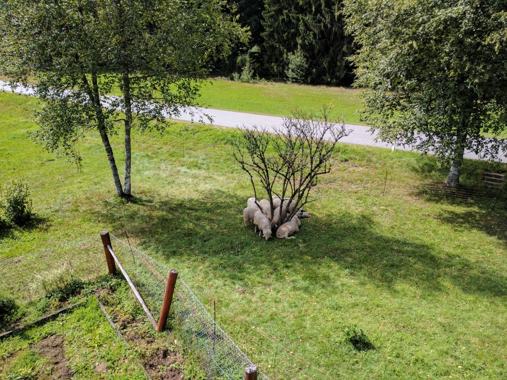 Jetzt dürfen sich sich noch rund ums Haus fressen. Und die Wiese vor bzw. links und rechts vom Gemüsegarten war noch unberührt. D.h., bis vor kurzem lag dort noch keine Schafsdung. Das hat sich mittlerweile geändert. Die Johannisbeer-Büsche haben zudem eine Kurzhaar-Frisur verpasst bekommen; denn für Schafe scheinen auch die Blätter schmackhaft zu sein, wenn man denn an sie heran kommt. Ohne Schatten findet die August-Hitze jedes Waldschaf doof, vor allem wenn der Schafscherer noch auf sich warten lässt. Angesichts der Wolfsgeschichten hier im Bayerischen Wald ist es uns derzeit ganz recht, wenn die Schafe im Moment so nah am Haus sind. Und im Winter wird die Stalltür zu gemacht – das ist sicher.