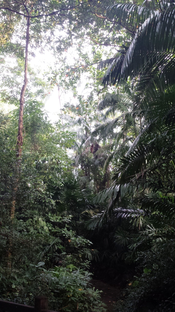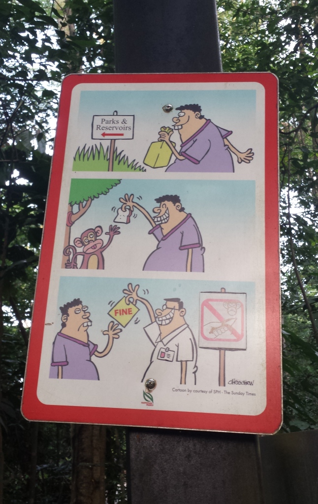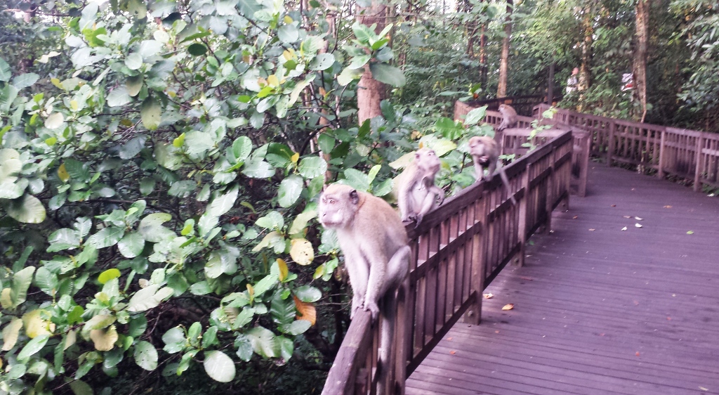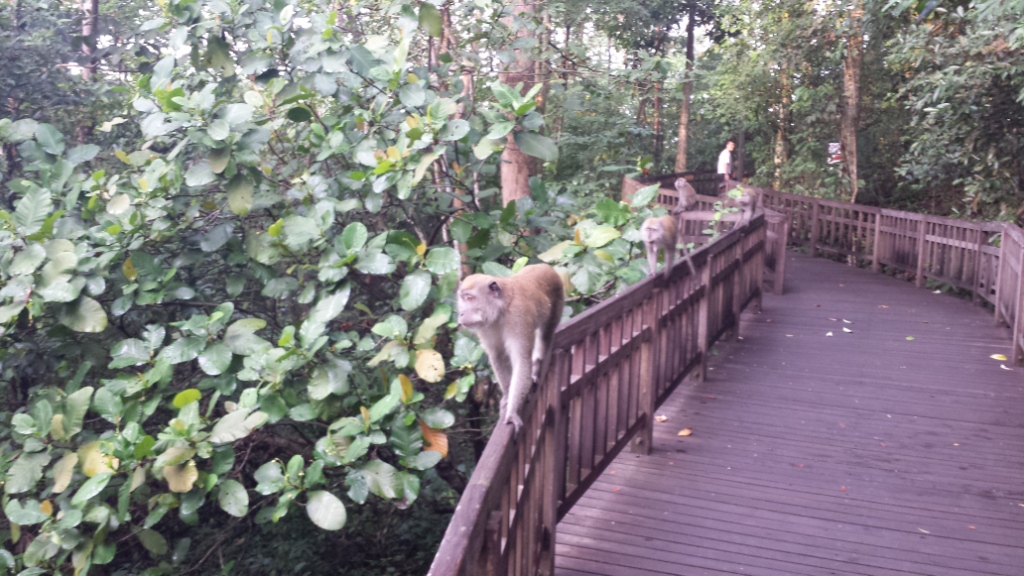 Vielleicht bin ich noch nicht an die hiesige Größe gewöhnt. Singapur ist ja „nur“ ein Stadtstaat und folglich kann ein Naturreservat auf dem Territorium dieses Staates keine großen Dimensionen haben. Das kleine Fleckchen Regenwald gilt als Geheimtipp in dem Sinne, dass für diesen Ausflug mit U-Bahn und Bus innerhalb des oft sehr kurzen Besuchszeitraums kaum Platz bleibt. Schade, denn wenn man den Abzweig erst einmal gefunden hat, wird man zumindest früh am Morgen von einer Affenbande begrüßt.