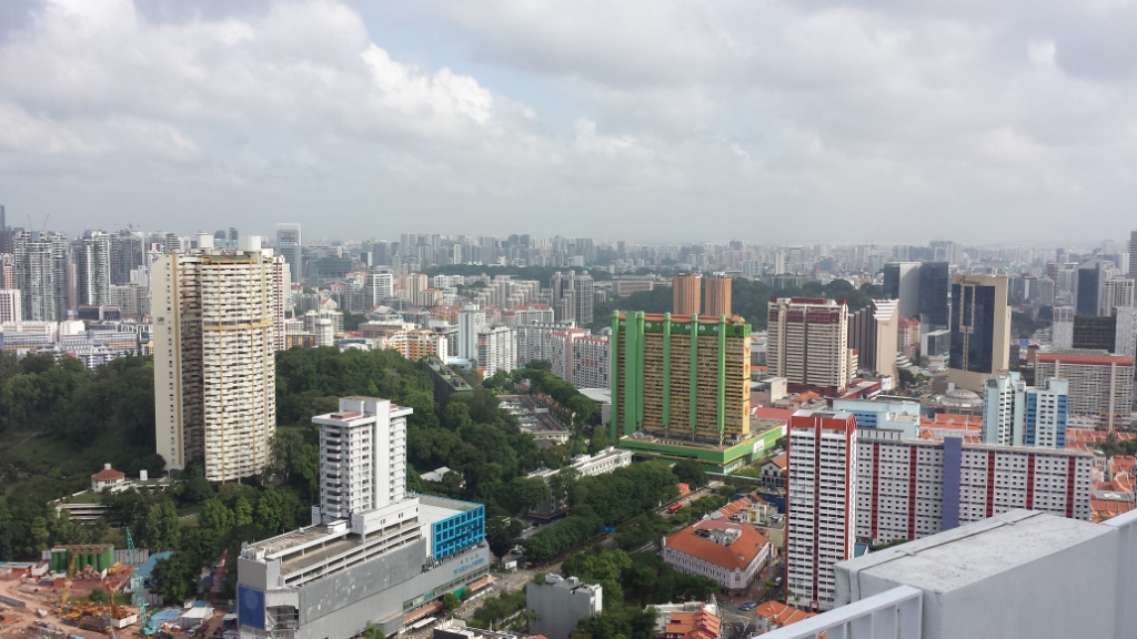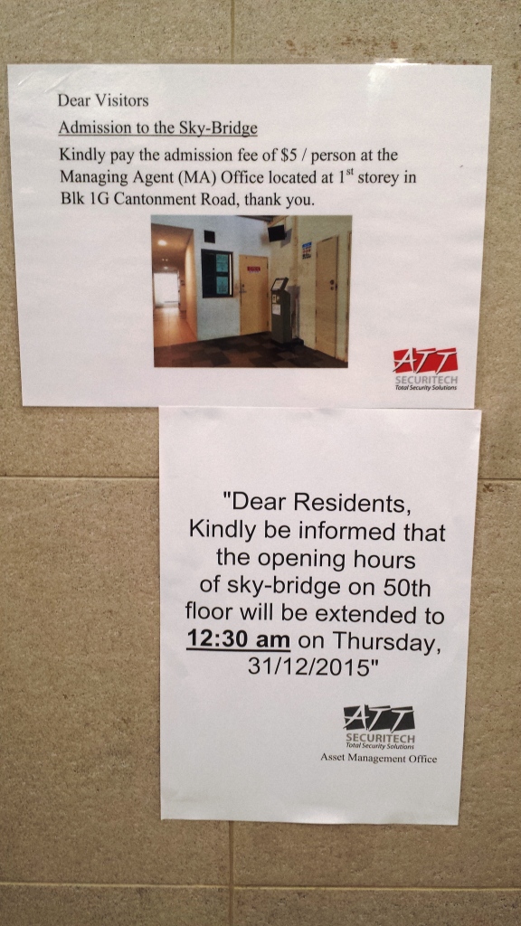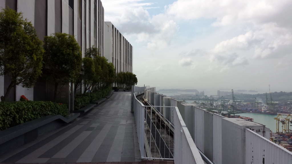 Auch als Besucher kann man in den 50. Stock fahren, wenn man vorher am Fuße des Turms 1G (nicht A, B, C, D, E oder F;-) normalerweise an einem (!) Automaten sein Ticket für 5 Singapur-Dollar gelöst hat (derzeit ist der Automat kaputt und man bezahlt bar beim Hausmeister). Dann geht es mit einem kleinen, unscheinbaren Aufzug hinauf. Wer hier Touristen treffen will, ist falsch. Denn der Skypark ist meistens leer. Wer den Ausblick über Teile von Singapur jenseits der bekannten Ansicht um die Marina Bay herum erleben will, der ist definitiv richtig.