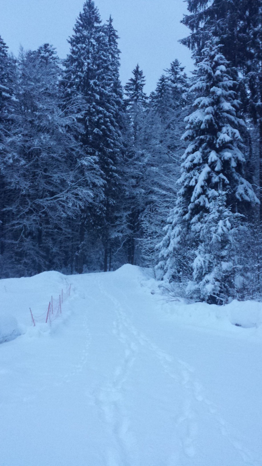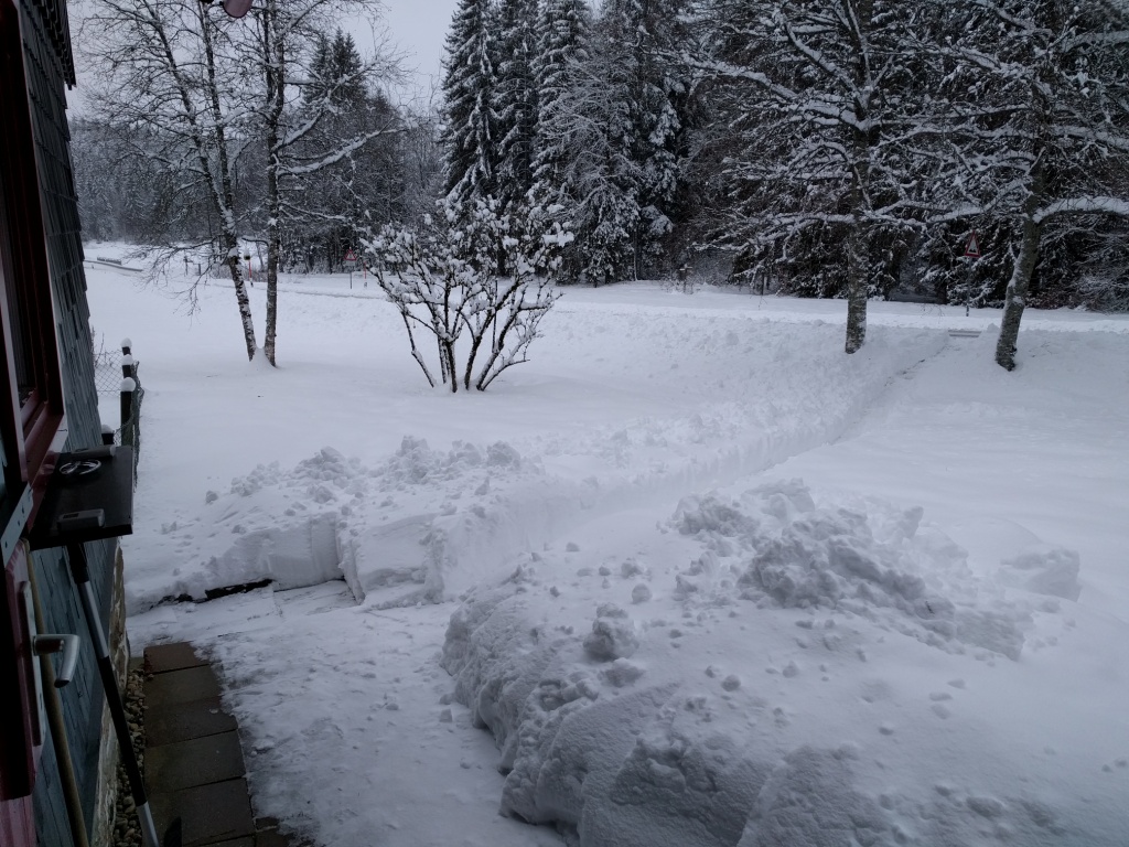 Interessanterweise war es mit dem Schnee dieses Jahr ganz anders als erwartet. Bei uns hatte sich knapp ein Meter angesammelt, ehe der Regen die weiße Pracht dahinschmelzen ließ. Dabei hätte ich gewettet, dass wir dieses Jahr bis Ostern auf die Frühlingsblüten hätten warten müssen. Dann kam die Kälte, die vor allem im Norden Deutschlands Schneemassen mit sich brachte und bei uns nur für einen weißen, flauschigen Belag sorgte, der kaum ausreichte, um die Loipen wieder in Form zu bringen. Allerdings ging die Waldhäuser-Runde immer. Der Frost über die letzten fünf Tage hat zwar das Wasser in der Bergerau teilweise zum Erstarren gebracht und für ungewöhnliche Eisfälle der Kleinen Ohe unter unserer überdimensionierten Straßenbrücke gesorgt, aber viel Neuschnee war bei uns nicht hinzugekommen, auch wenn es in der Luft so aussah. Denn der Wind blies wiederholt die leichten, unverklumpten Schneeflocken aus ihrer Ruheposition wieder in die Luft oder von den Bäumen.