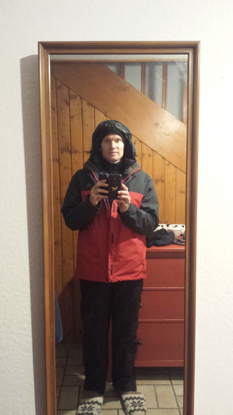 Mit dem schnellen Aufwärmen in der Stube war es nach unserer morgendlichen Rückkehr aber erst einmal nichts. Denn die frostigen Außentemperaturen ließen auch in der Wohnküche und auf Jacksons Schlafsofa die Temperaturen auf knapp über 12 Grad fallen, nachdem die Glut im Herd in der Nacht erloschen war. Also hieß es morgens wieder einheizen, ehe sich der Hund ein wenig aufwärmen konnte. (Ich hatte das Glück, in die Schlafküche im ersten Stock wechseln zu dürfen, wo ich mich vor den wärmenden Pelletofen stellen konnte, der sich redliche Mühe gab, die einstelligen Temperaturen im Schlafbereich auf ein erträgliches Maß anzufeuern.) Ganz so bedrohlich, wie es sich bisher lesen mag, war es dann aber doch nicht. Wir haben in der letzte Woche immer alle Öfen angeschmissen und innerhalb von zwei Stunden abgesehen vom Flur (und gewollt der Speisekammer) das Haus einigermaßen warm bekommen. Allerdings durften wir in unseren Bemühungen nicht nachlassen, was wiederum zur Folge hatte, dass ich mit dem Zersägen und Spalten der großen Baumstücke kaum hinterhergekommen bin. Aber noch ist Käferholz hinter den Garagen übrig und wird bis zum Frühsommer reichen.