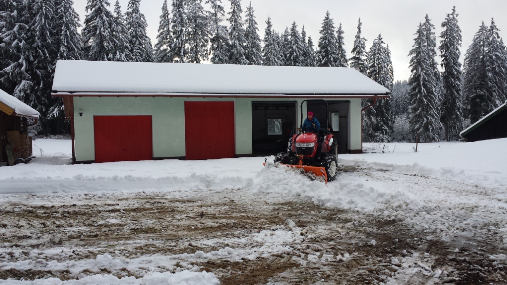 Nach dem Frühstück wartet die richtige Arbeit. Der Weg bis zur Straße muss frei geräumt werden, die Solarzellen auf dem Garagendach zumindest vom Schnee befreit werden. Die letzte dünne Schicht festgefrorenen Schnees taut hoffentlich die Sonne weg und lädt dann hoffentlich auch die Batterie ein wenig auf.