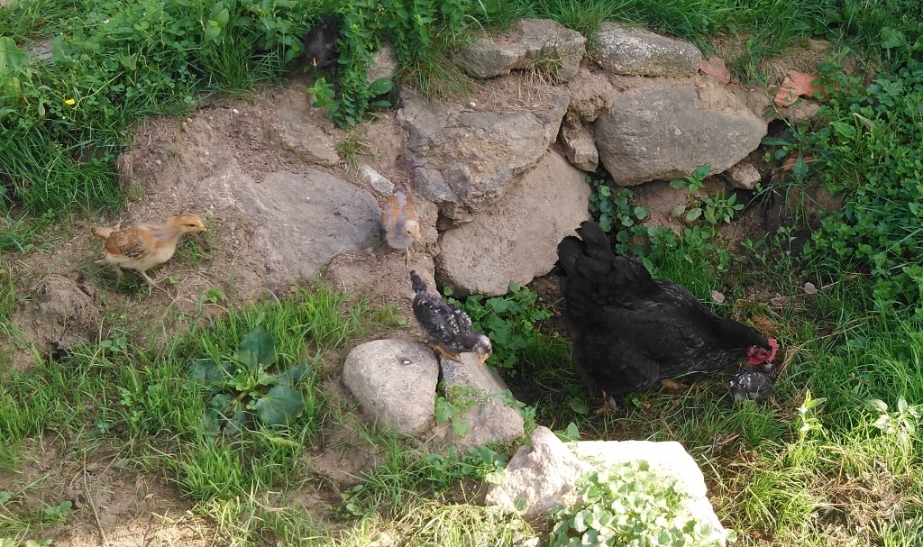 Nach dem Schlüpfen war es unter den Federn der Glucke sicher und warm. Wenn man zu Besuch in den Stall kam, um das Futter nachzufüllen, ploppte irgendwo aus dem schwarzen Gefieder erst ein dann zwei oder mehrere Köpfe auf, so dass wir zu Beginn gar nicht so genau wussten, wie viele Küken denn nun wirklich geschlüpft sind. Mittlerweile ist es klar: ein helles, ein graues und drei schwarz-gemusterte.