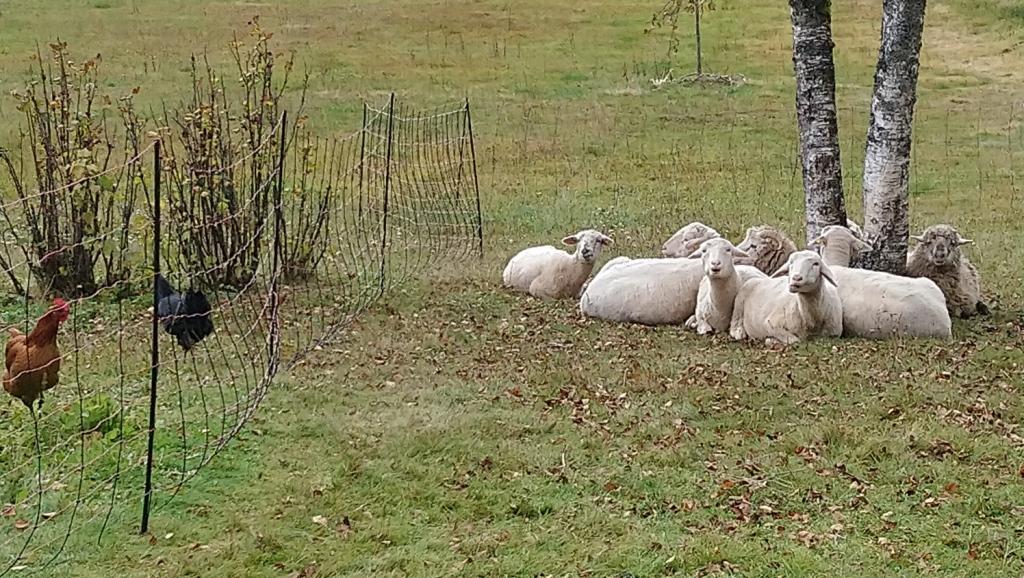 Als nächstes dürfen die Hühner in den Gemüsegarten, um auch hier alles ordentlich durchzupflügen mit ihren Schnäbeln und kraftvollen Hühnerfüßen, so dass die Schneckenpopulation im kommenden Jahr ähnlich gering ausfällt wie in diesem. Zwei Rosenkohl- und zwei Grünkohlpflanzen sind noch übrig. Ansonsten hat der Frost in den vergangenen Nächten begonnen, das Grün aus den Pflanzen zu holen. Es dauert mittlerweile bis zum späten Vormittag, ehe die Sonne bei uns im Tal das Thermometer deutlich über die Nullgradmarke drückt. Das Gras direkt am Boden bietet den Schafen dennoch ausreichend Nahrung, so dass wir ihnen weiterhin jeden zweiten Tag ein neues Stück Wiese anbieten. Der Winterstall mit ausreichend Heu steht allerdings schon bereit. Im Moment stehen sie wieder vor dem Haus und nutzen die Birken als Sammelpunkt zum Wiederkäuen. Es gibt kaum etwas Beruhigerenderes als eine kleine Herde Schafe, die entspannt zusammen liegen und in ähnlichem Rhythmus ihre Kiefer kreisen lassen.