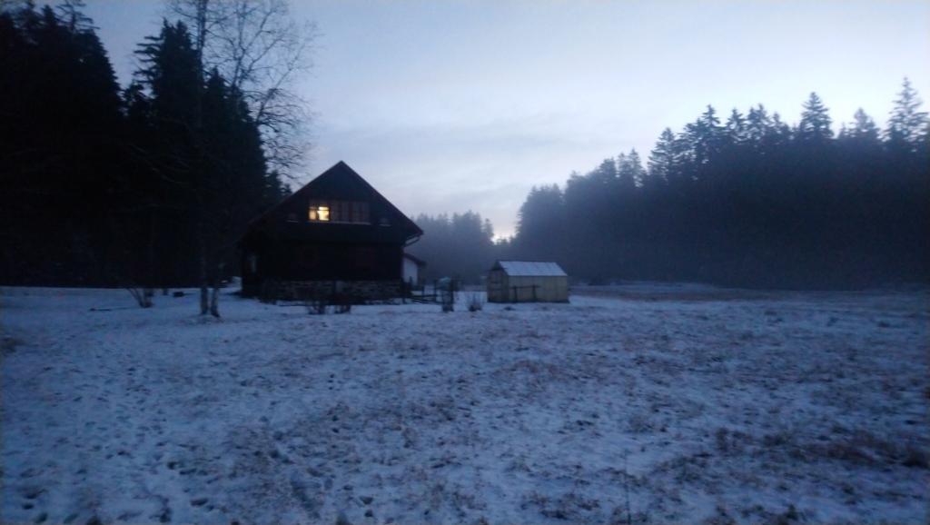 Man muss allerdings schon sehr genau hinschauen, um rechts am Haus den Hahn vor der Stalltür zu entdecken. Dafür ist die Ansicht von unserem Haus in schwarz und rot in der Winterlandschaft einfach schön.