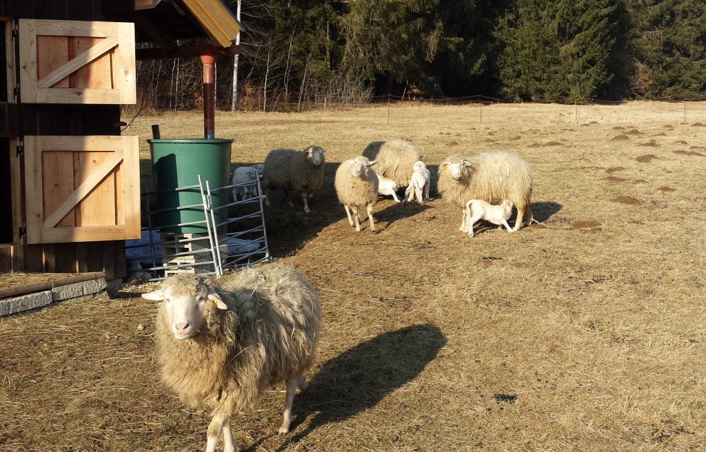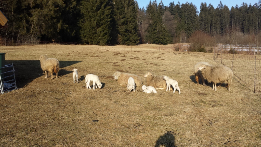 Das Umsteckens des Weidezauns mussten unsere zehn wollenden Rasenmäher im Stall abwarten. Aber dann ging es gleich ran an das neue Grün.