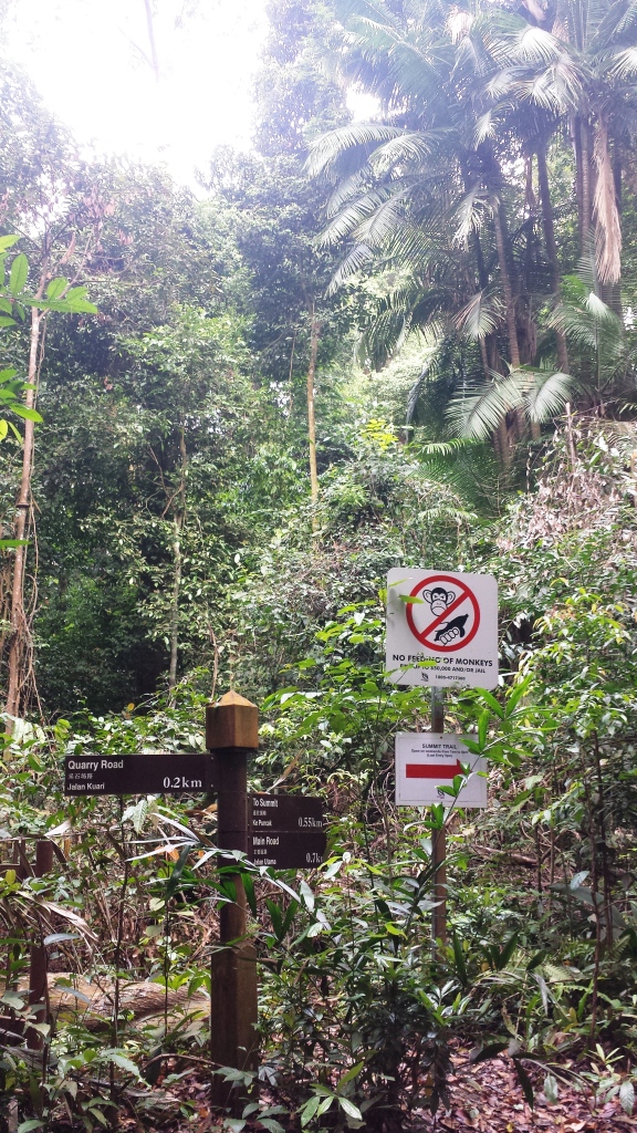 Vielleicht bin ich noch nicht an die hiesige Größe gewöhnt. Singapur ist ja „nur“ ein Stadtstaat und folglich kann ein Naturreservat auf dem Territorium dieses Staates keine großen Dimensionen haben. Das kleine Fleckchen Regenwald gilt als Geheimtipp in dem Sinne, dass für diesen Ausflug mit U-Bahn und Bus innerhalb des oft sehr kurzen Besuchszeitraums kaum Platz bleibt. Schade, denn wenn man den Abzweig erst einmal gefunden hat, wird man zumindest früh am Morgen von einer Affenbande begrüßt.