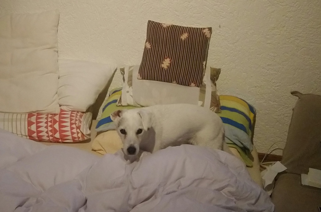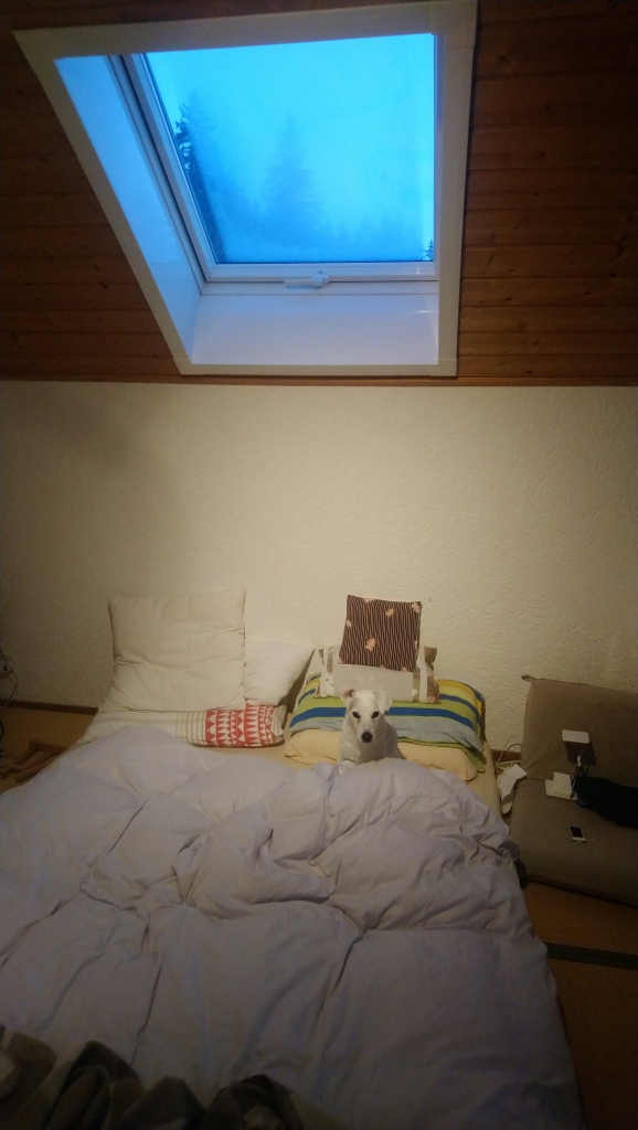 Bei meinem kurzen Spaziergang mit Hanabi konnte man zudem den Rauch aus dem Kamin kerzengerade in den Himmel steigen sehen, während der halbe Mond schon über dem Waldrand stand. Hanabi hält sich am liebsten oben im Bett auf. Dank eines Östrogen-Präparats ist ihre Inkontinenz auch deutlich zurückgegangen.